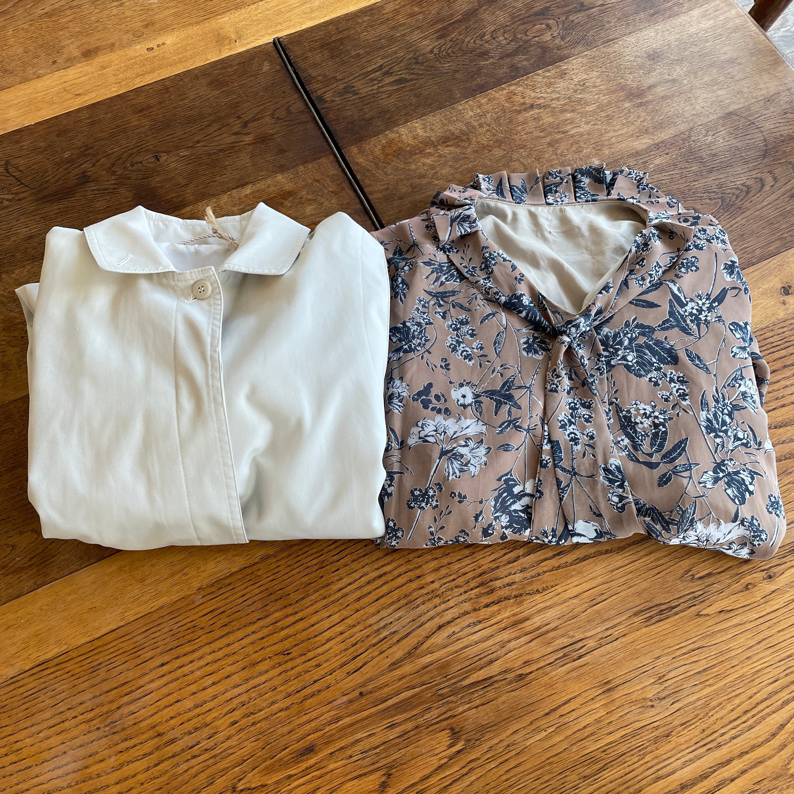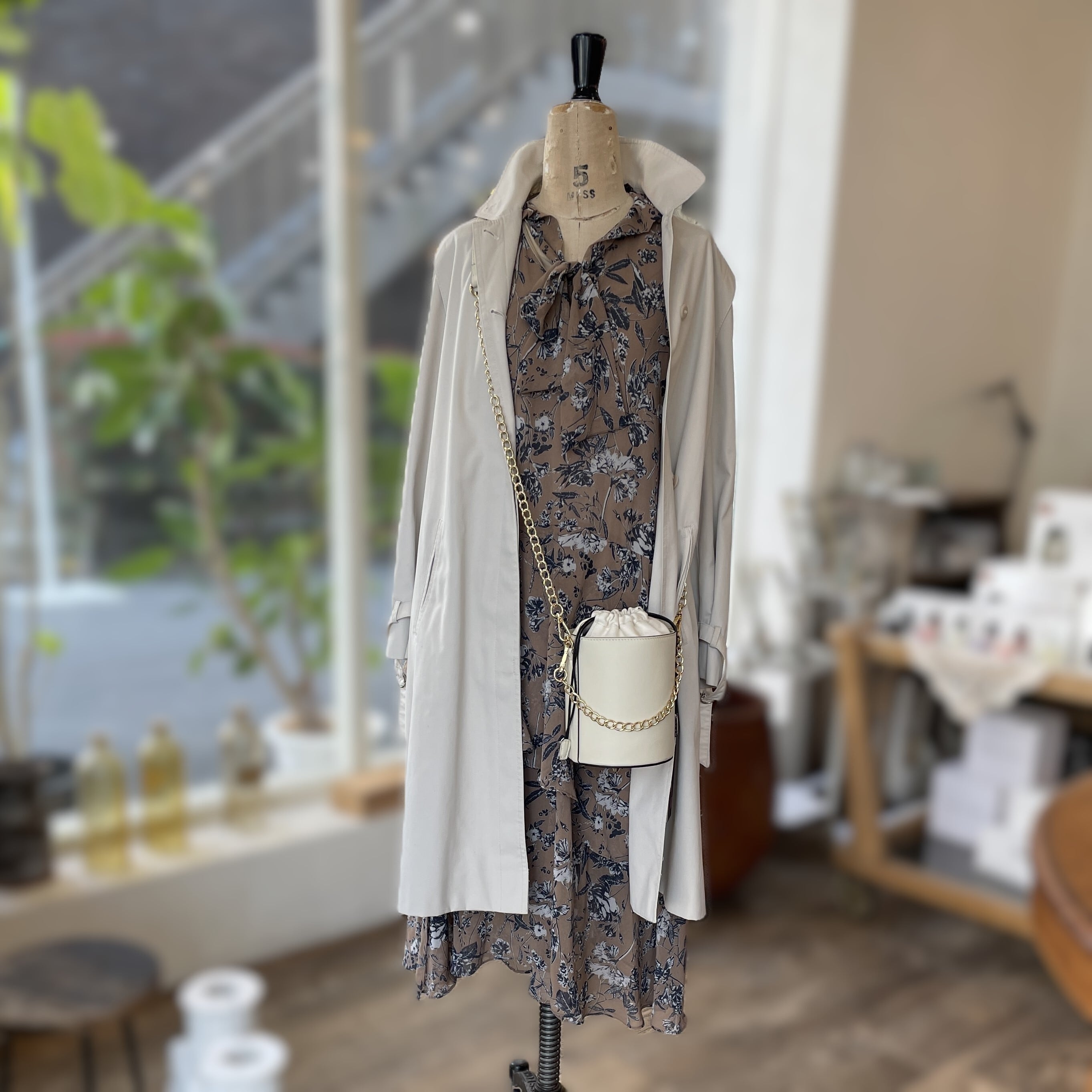薄手のコートとワンピースのセットです。ベージュのコートは季節の変わり目には必須アイテム。シンプルで使いやすくどんなコーデにも合わせられます。