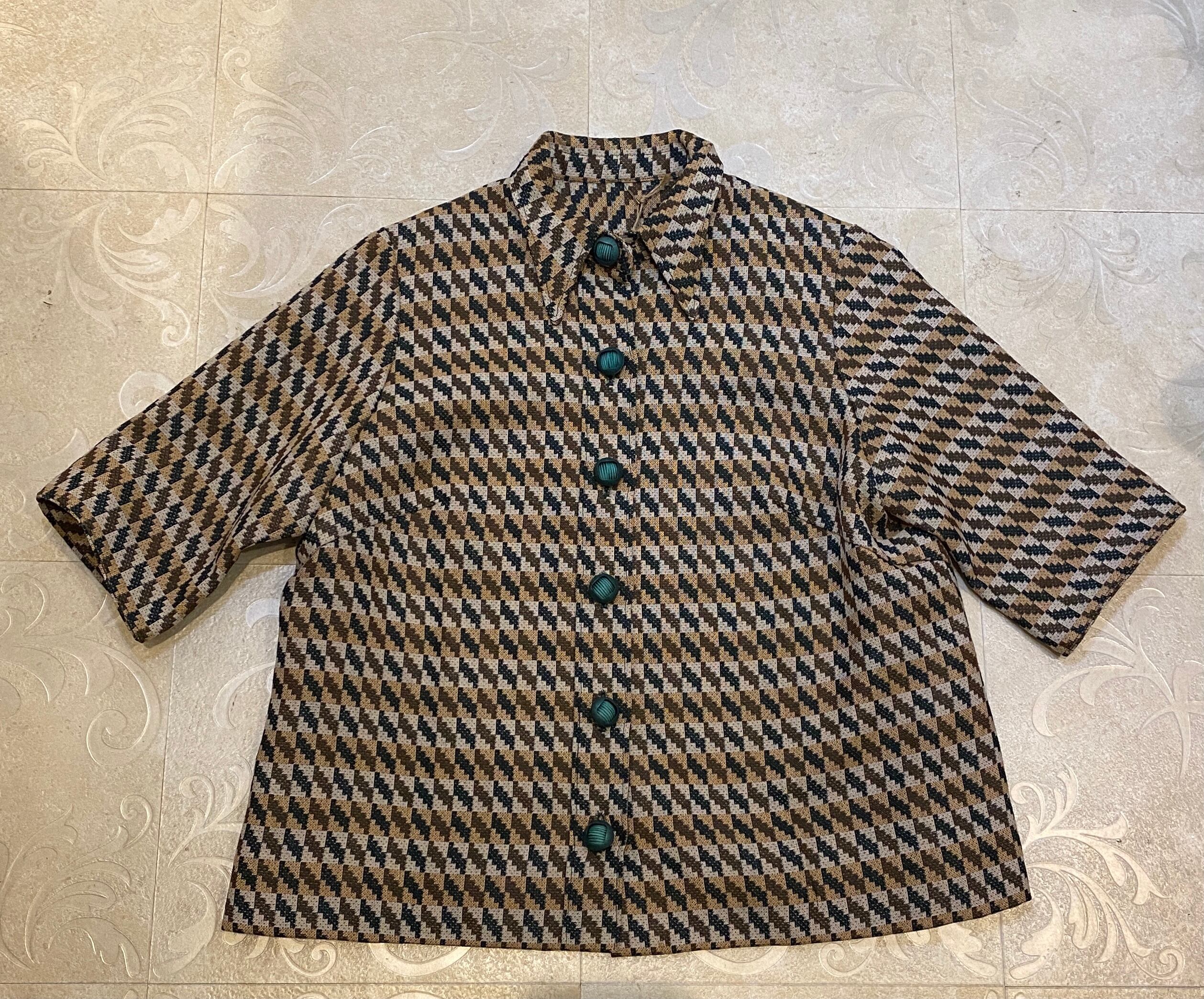 柄が特徴的なシャツ。緑の大きなボタンがポイントです。生地がしっかりしていて、使用感の少ない商品です。