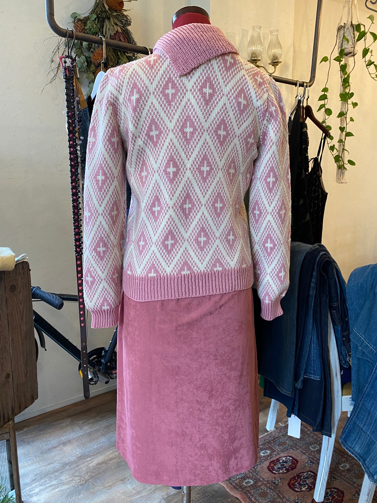 可愛らしいピンクカラーで柄が特徴的なニットです。裾部分にやや毛玉があります。