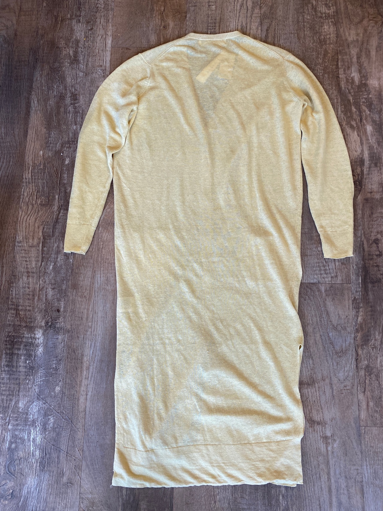 麻素材のロングカーディガン。ベージュに近い黄色なので着回しがきき、シワにもなりにくいです。