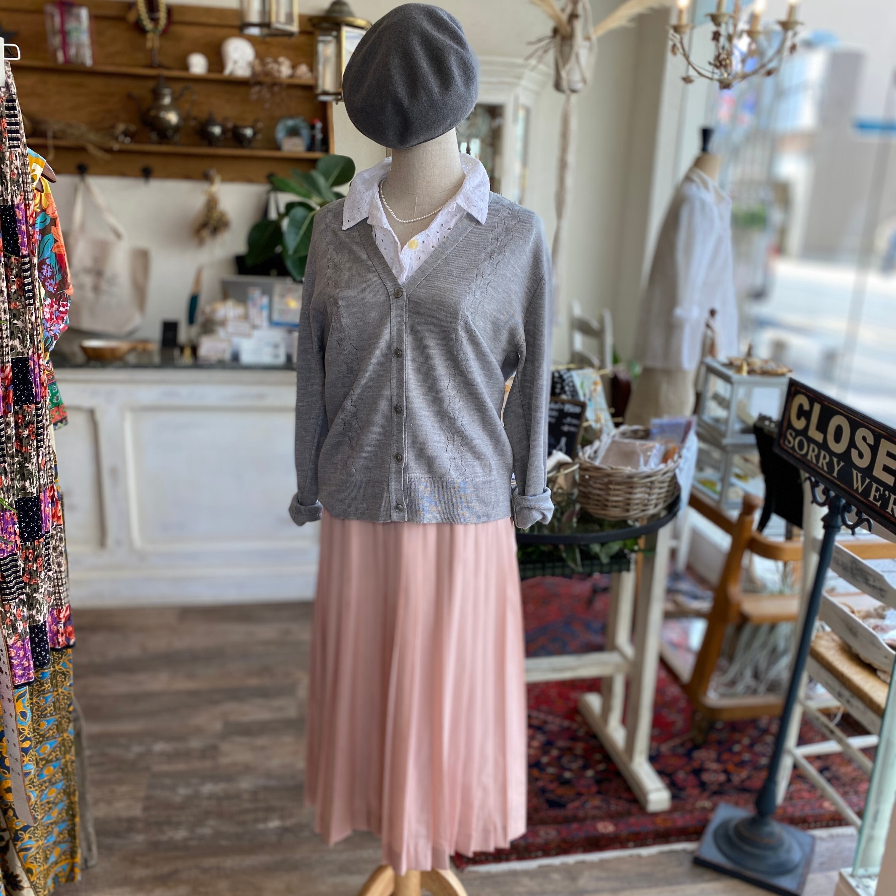 コーディネートごとお買い求めで最大【32.5%OFF フランス古着 Courtelle Vネックグレーカーディガン + ピンクプリーツスカート + コットン襟付きノースリーブシャツ+ベレー帽 インスタ コーデ買いで、大変お買得なセットです。