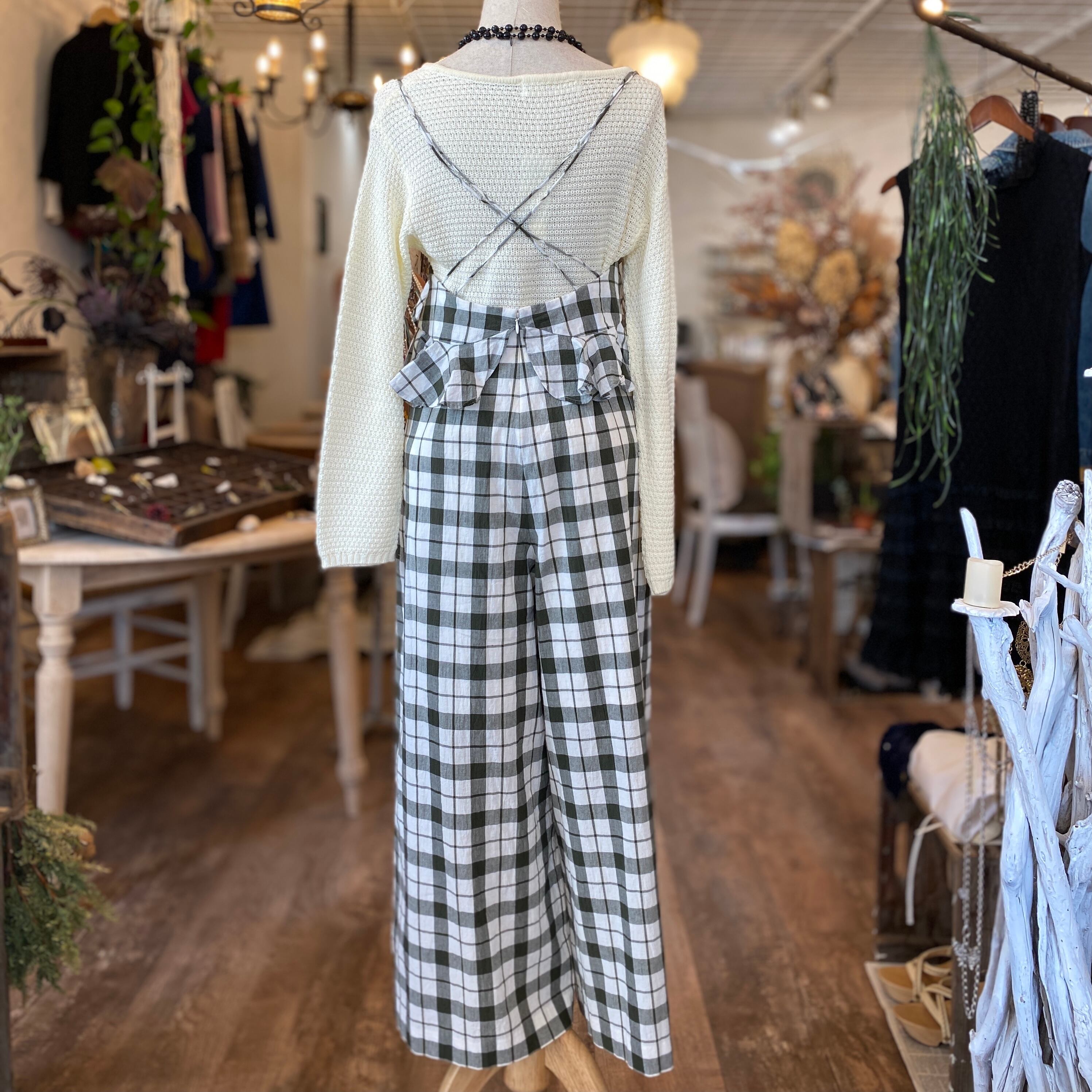 古着 コーディネート買い セット商品 ルームウェア le vent soufflé ホワイト 長袖ニット + 古着 SNIDEL チェック オールインワン サロペット + USEDアクセサリー rienda 黒 ボール ネックレス