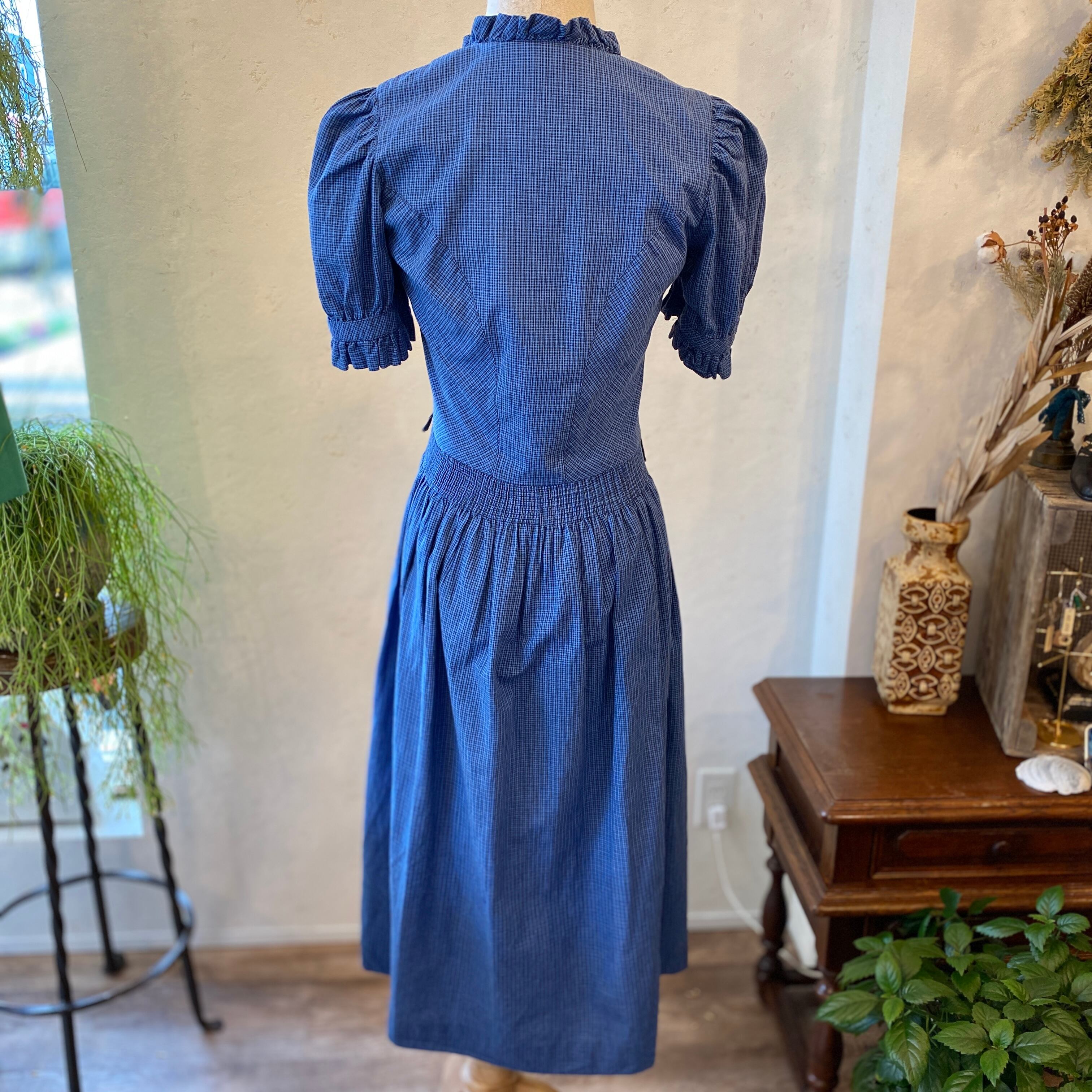 フリルがあしらわれたパフスリーブとシルバーのボタンが可愛らしいクラシカルなワンピースです。Vネックになっており、カラーも落ち着いたブルーなので可愛らしさも上品さもゲットできます♪