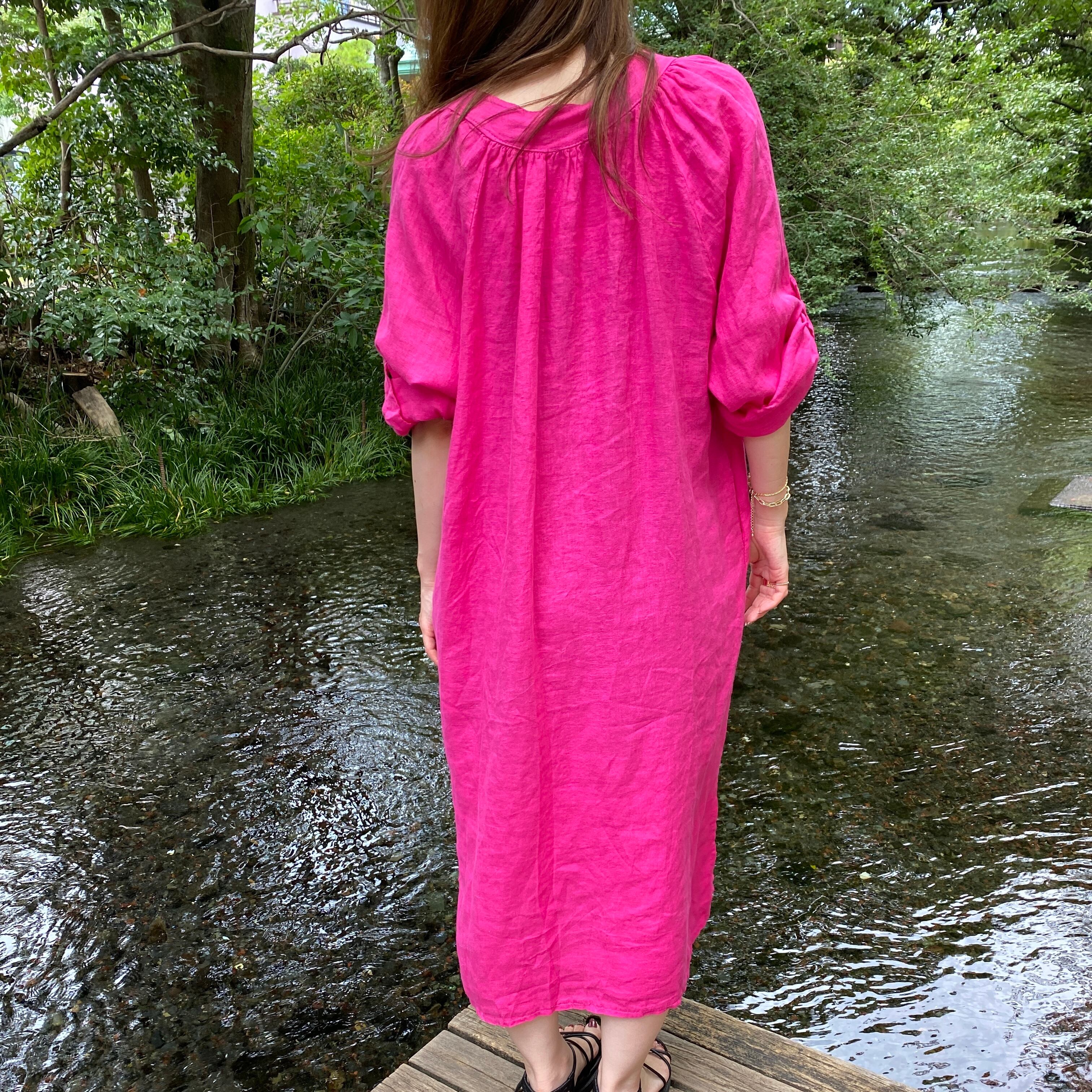 イタリア製 麻100% キーネック前開きワンピース <ピンク>