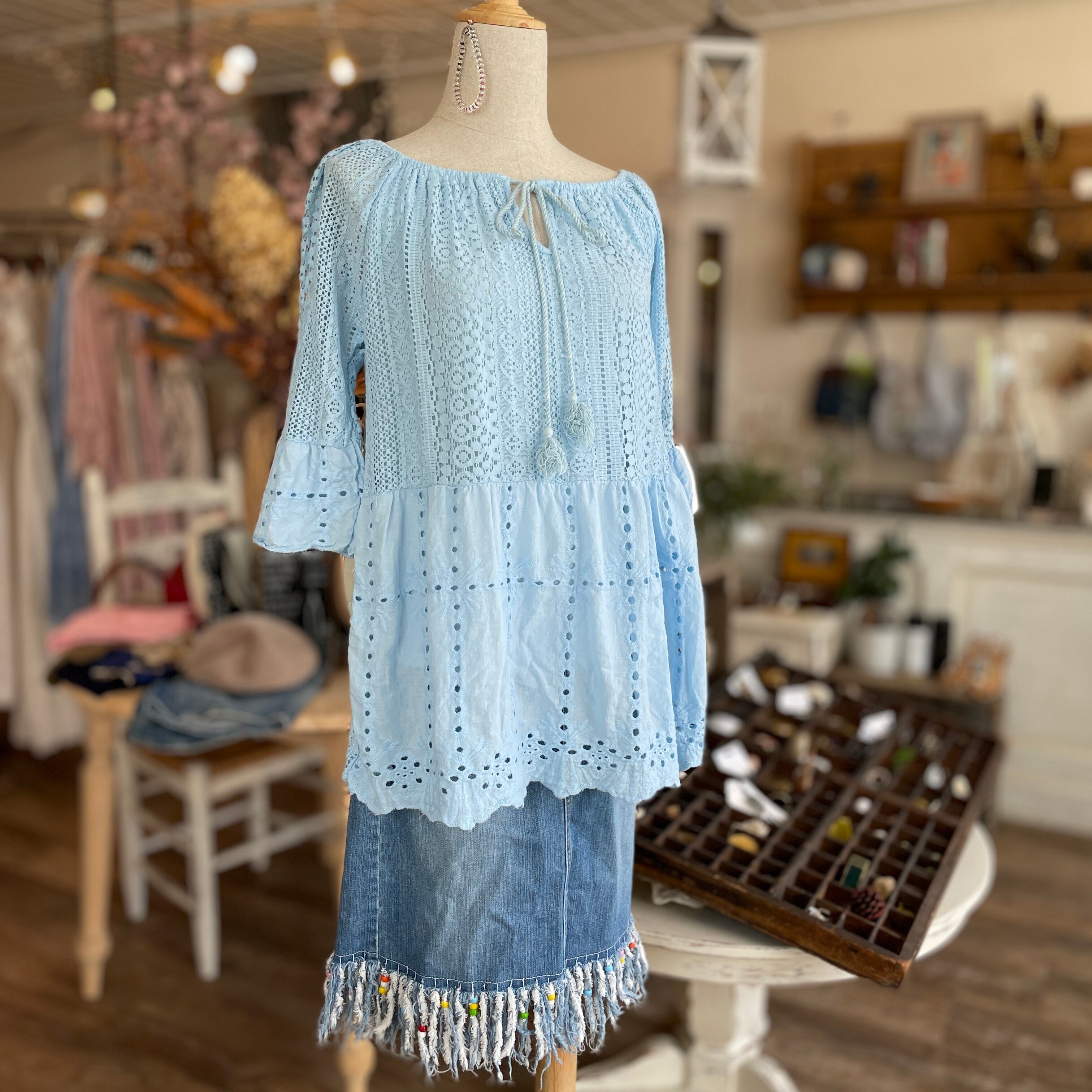 トップス: イタリア製 ベルスリーブトップス ライトブルー