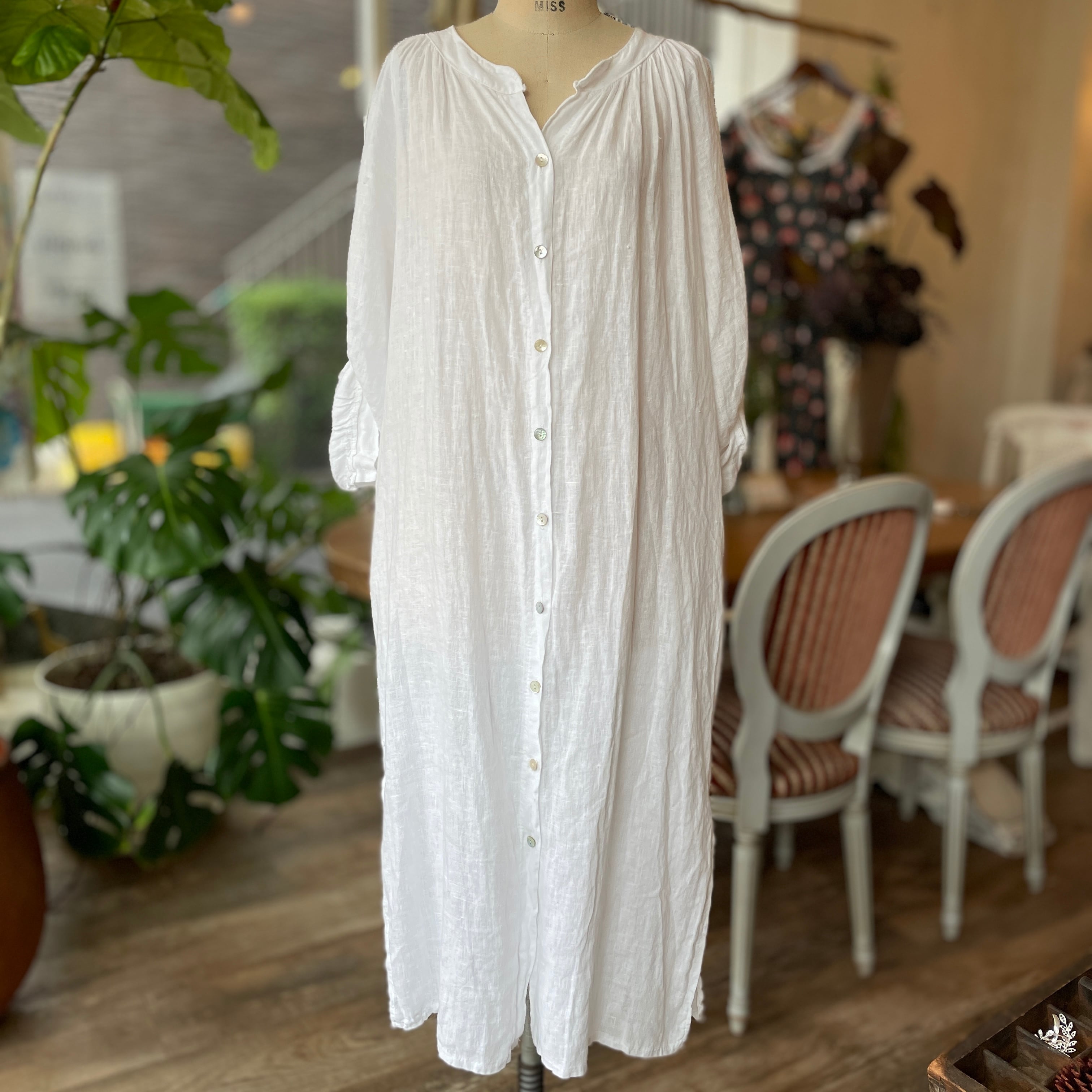 イタリア製 麻100% キーネック前開きワンピース <ホワイト>
