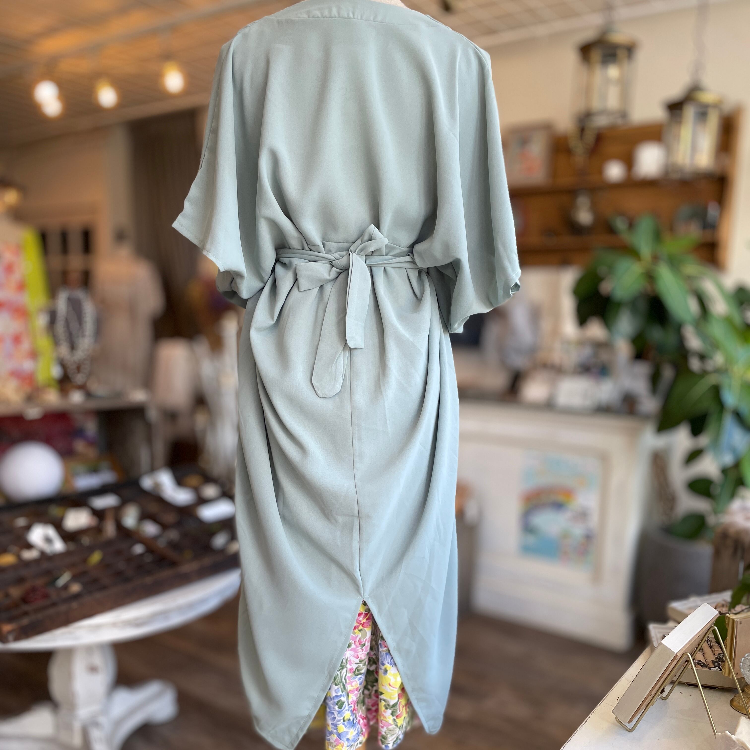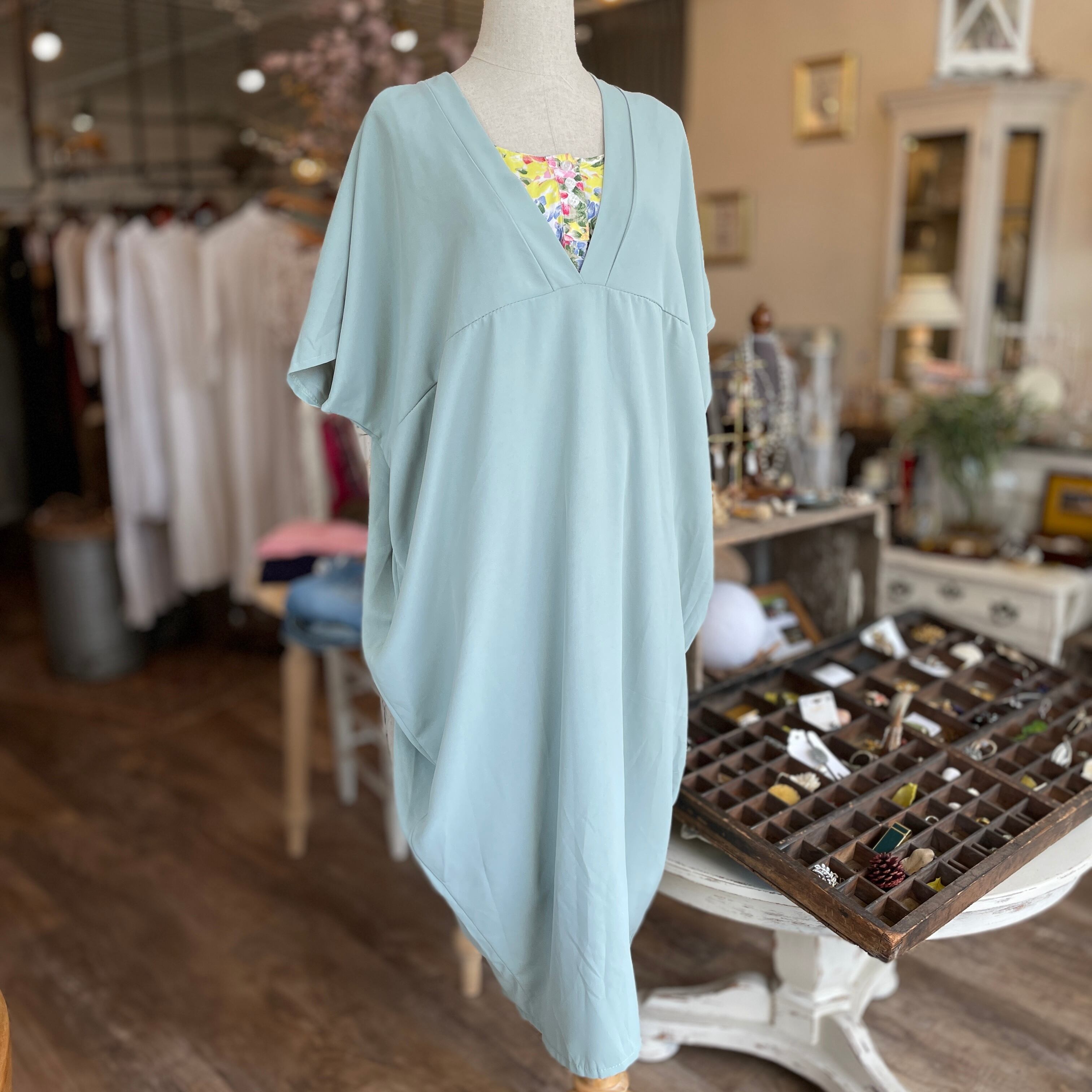 鮮やかなワンピースをチラ見せ♪ フロントの3連ボタンが可愛らしいです。ミントのワンピースが大人っぽく、さらにVネック部分が味を出してくれます◎
