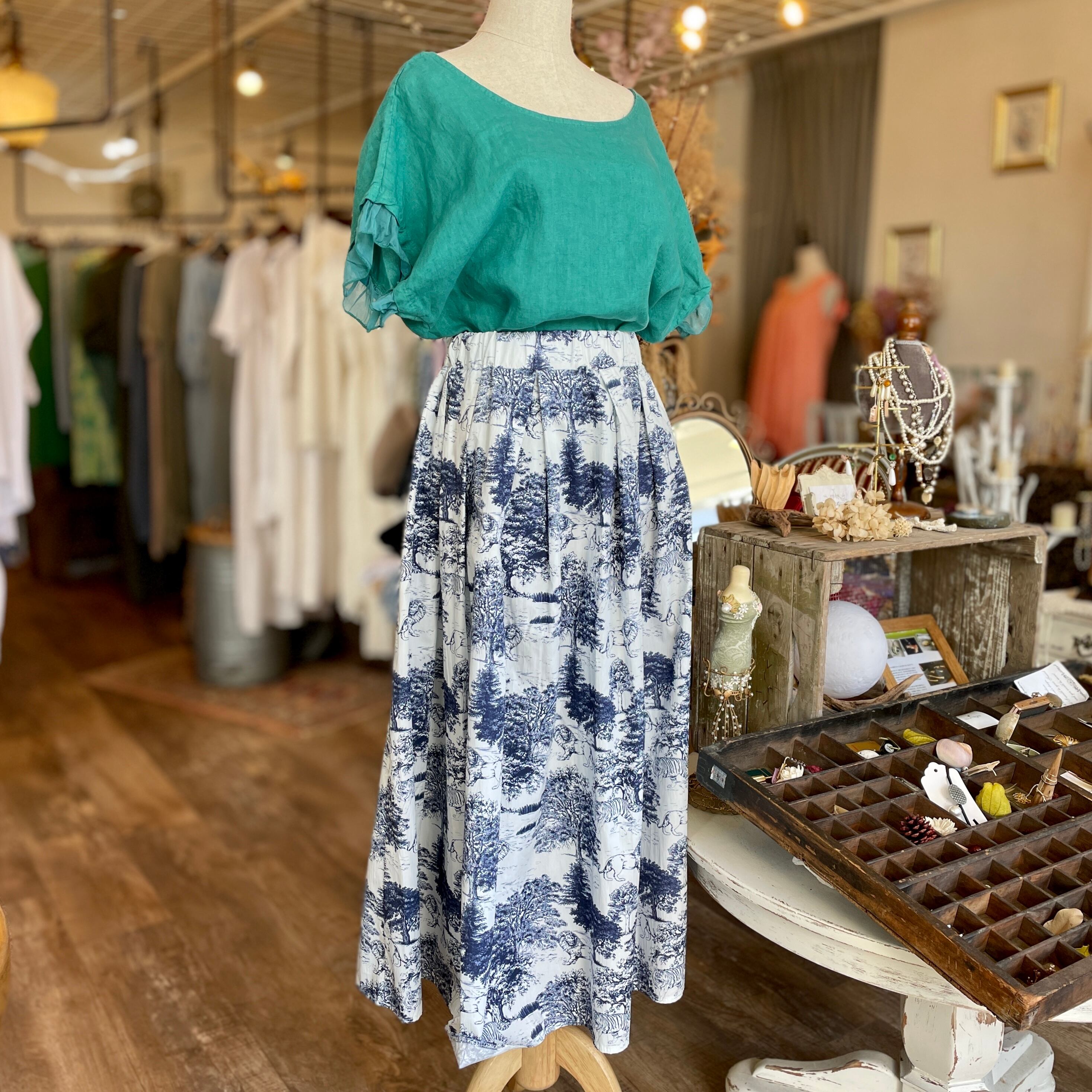 アンティークなトワルドジュイ柄のスカートが主役です♪麻素材のトップスは鮮やかなグリーンに。スカートのネイビーと合わせることでキレイめカジュアルコーデが完成しました♪