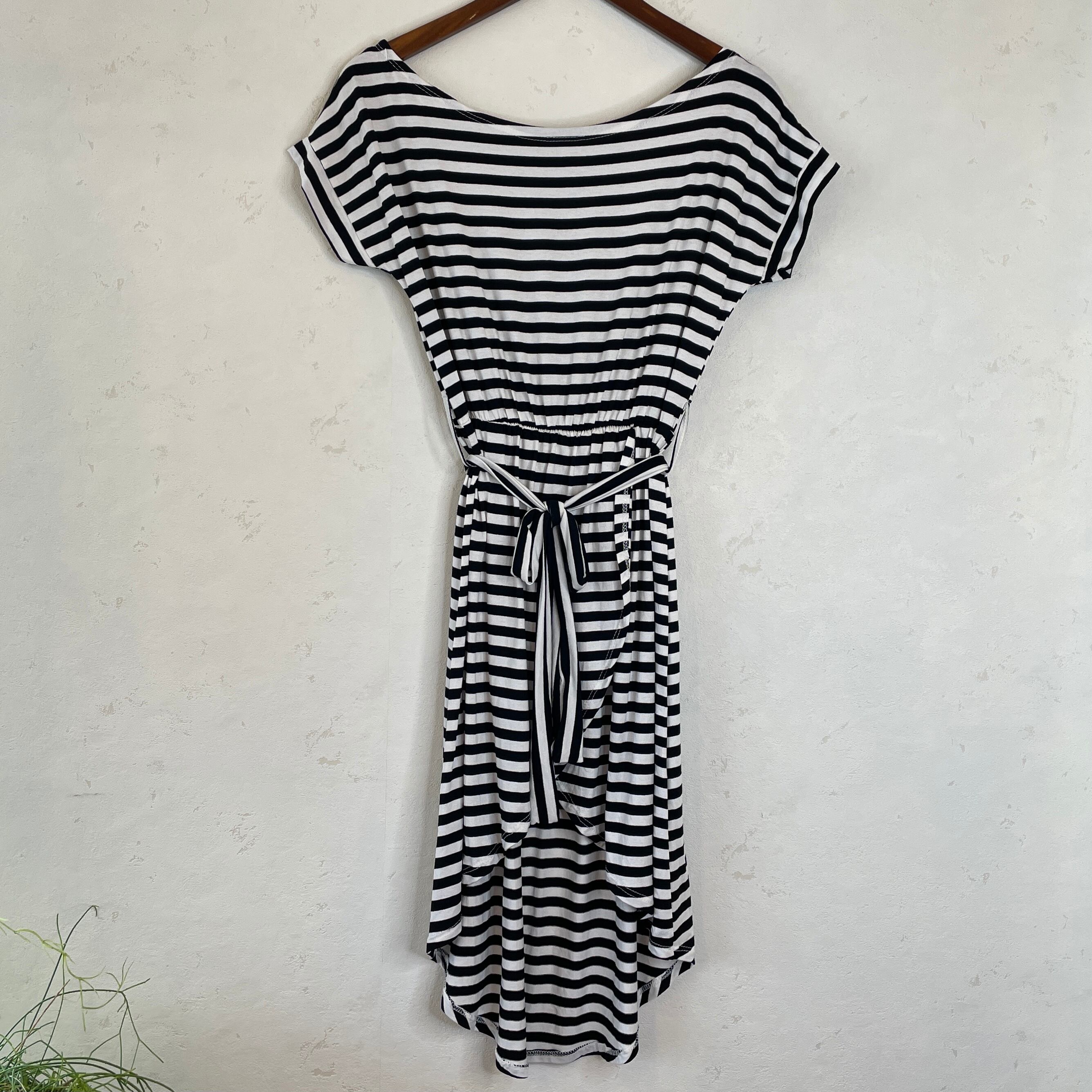 バックに対してフロント丈が短い爽やかなボーダーワンピース。腰回りはリボンでウエストアップになります。カジュアルに、キュートに、気分の上がるとても夏らしいアイテムです♪
