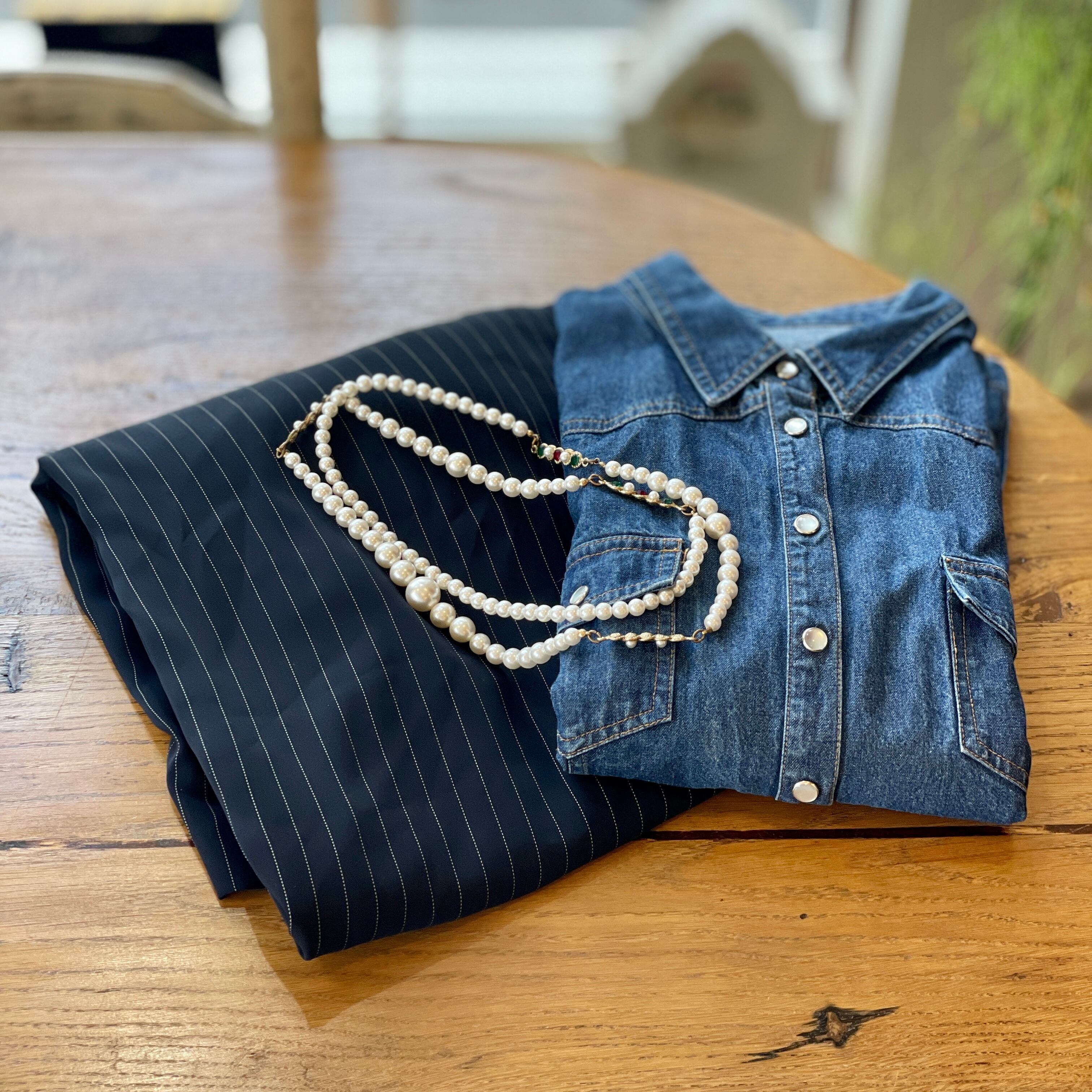 [コーデ買い] で【 30%OFF! 】3点 フランス古着 デニムシャツ + 古着 FRAY I.Dピンストライプパンツ + USEDアクセサリー ストーン付きパールネックレス