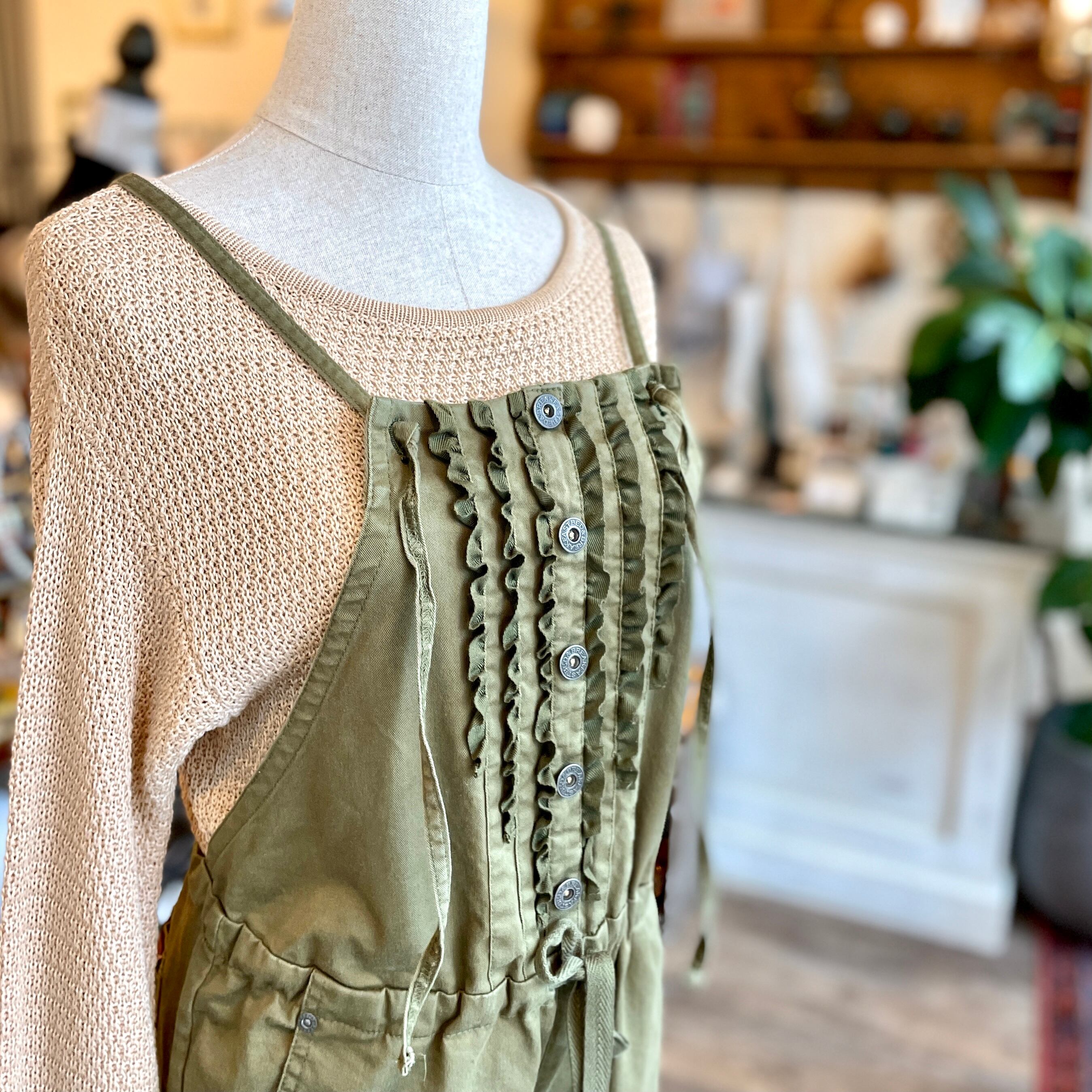 [コーデ買い] で【 30%OFF! 】2点 古着 カーキフリル付きサロペット + le vent soufflé 長袖ニット<ベージュ>