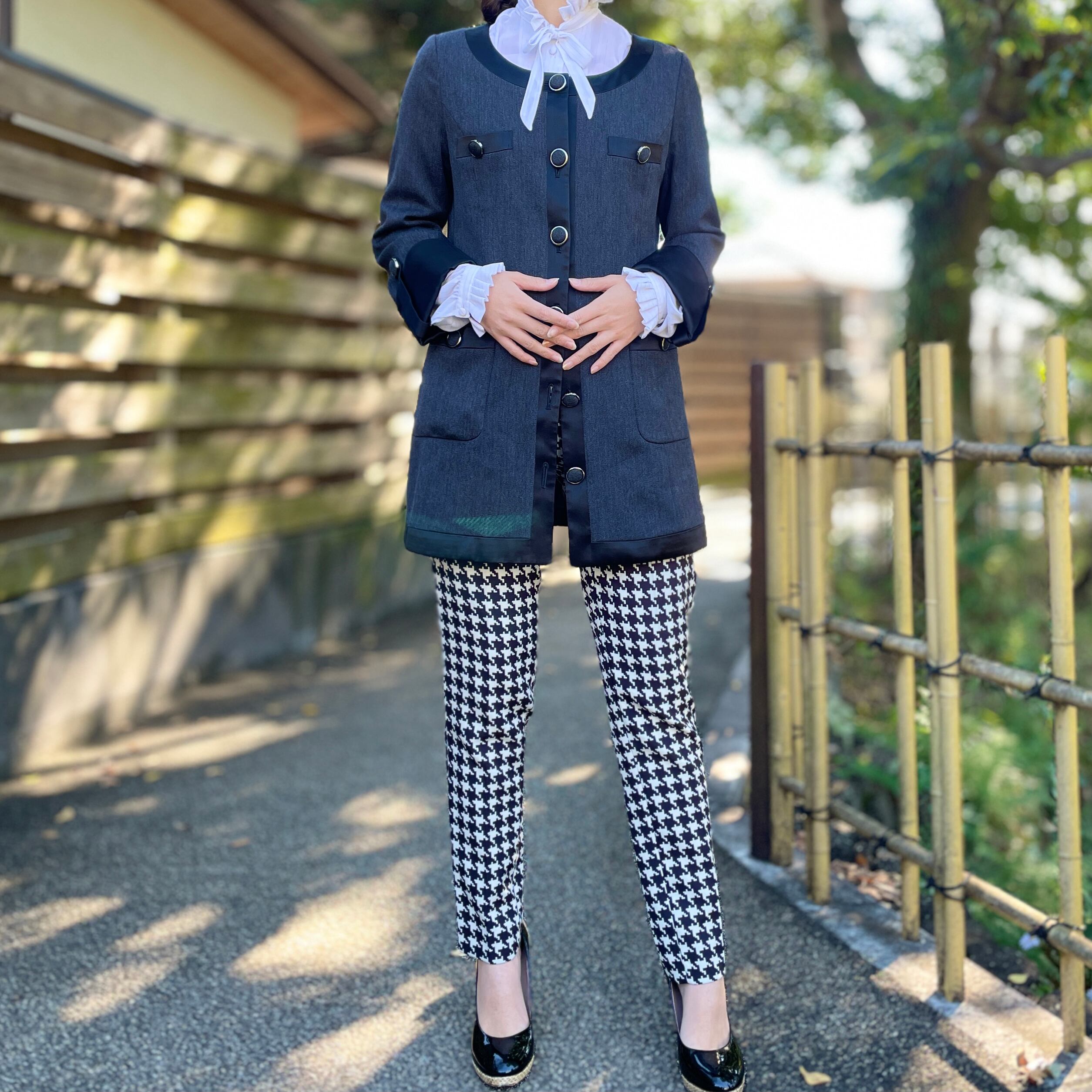 ダークカラージャケットに白のブラウスが映えて素敵です。細身のパンツが身体のラインを綺麗に見せてくれます。フォーマルな場面でも活躍してくれる上品なコーディネイトです。