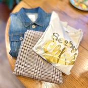 See By Chloe のロゴTシャツにチェック柄スカートとデニムジャケットを合わせたコーディネイト。デニムアイテムを取り入れるてよりカジュアルな印象に♪