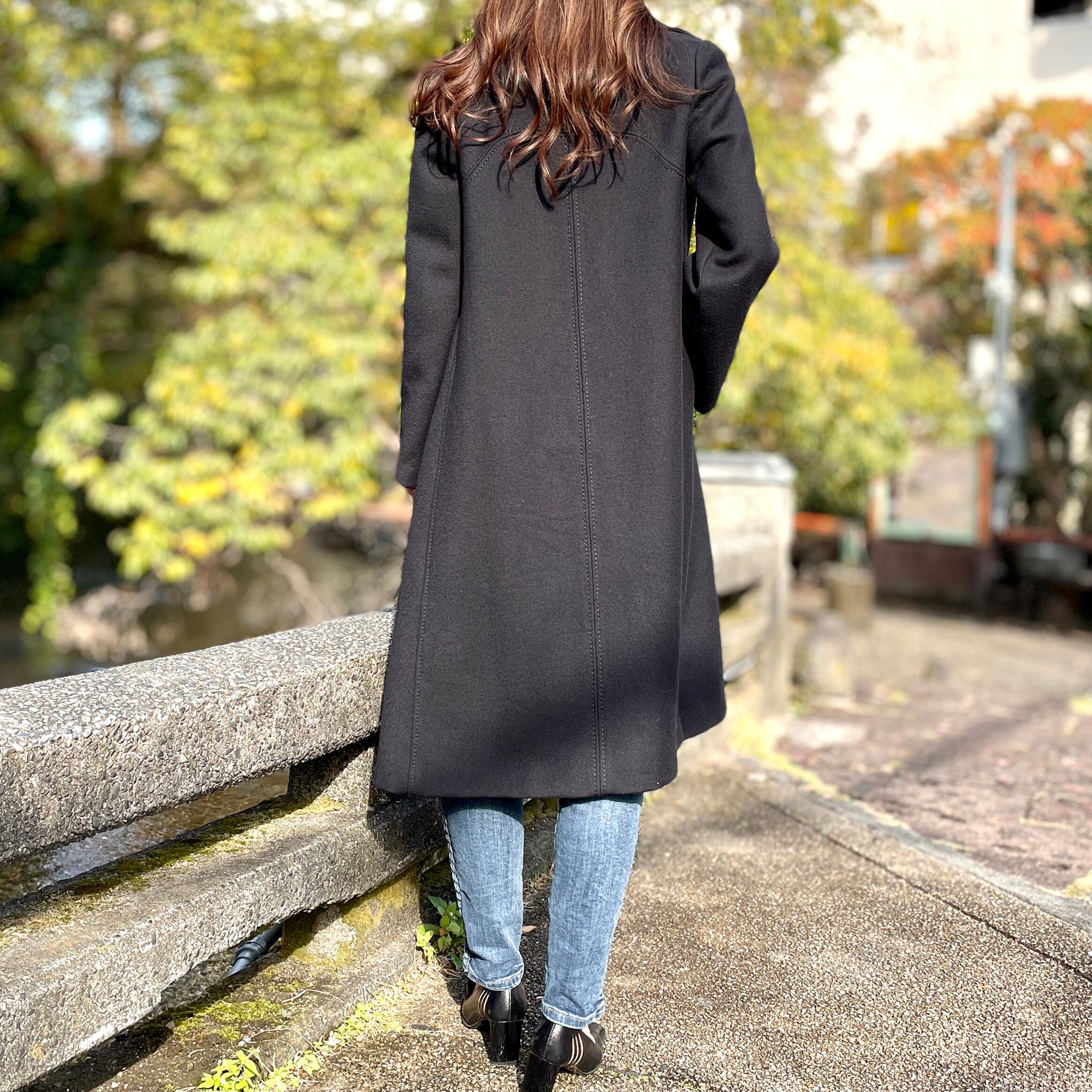 ブラウスの艶感と胸元のリボンが上品で綺麗な印象。デニムパンツと合わせてカジュアルに普段使いしやすいコーディネイトに♪ 厚手のコートで防寒対策もバッチリです。