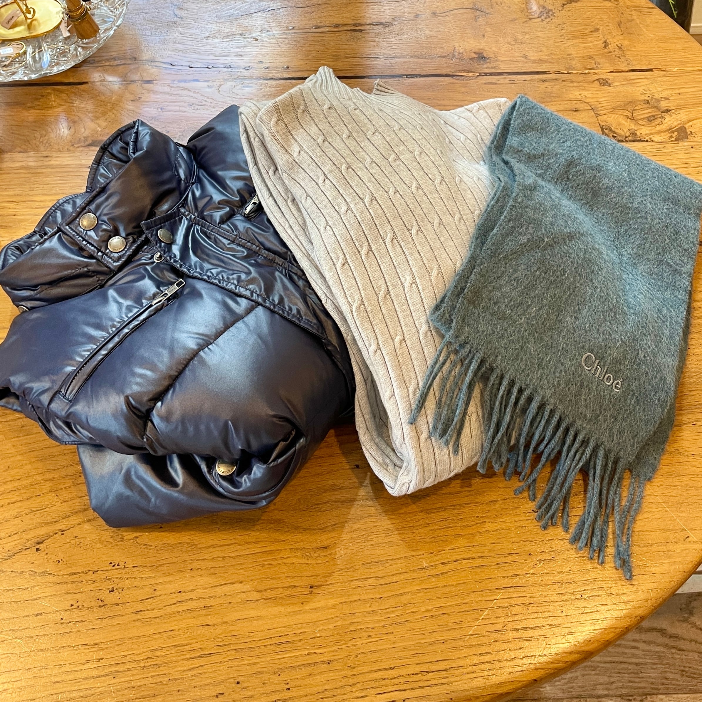 [コーデ買い] で【 30%OFF! 】3点 イタリア製 ハイネックケーブルニットワンピース<グレー> + 古着 See By Chloe ダウンベスト + USED Chloe カシミヤ100%マフラー