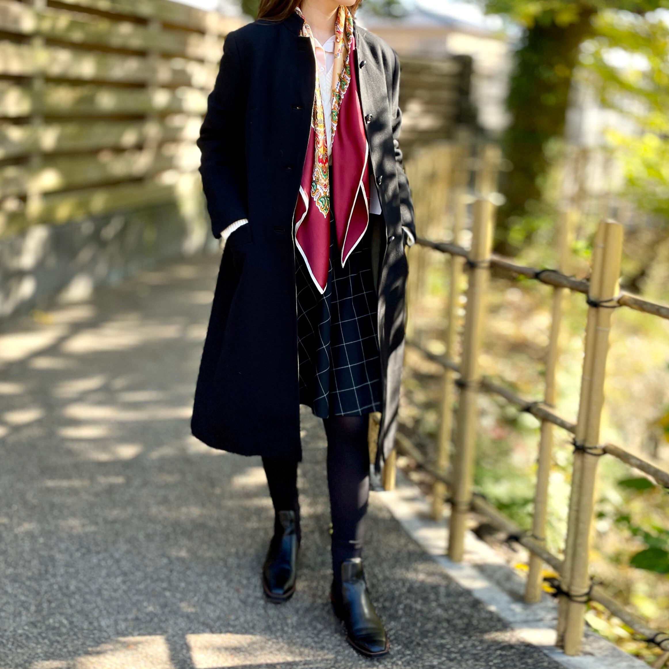 [コーデ買い] で【 35%OFF! 】5点 古着 MELTON HOUSE シャツ + USED オーナメント柄スカーフ + フランス古着 GRIFFON FRERES 長袖白ニット + 古着 JILL STUART チェック柄スカート + フランス古着 ヴァージンウール100% スタンドカラーブラックコート