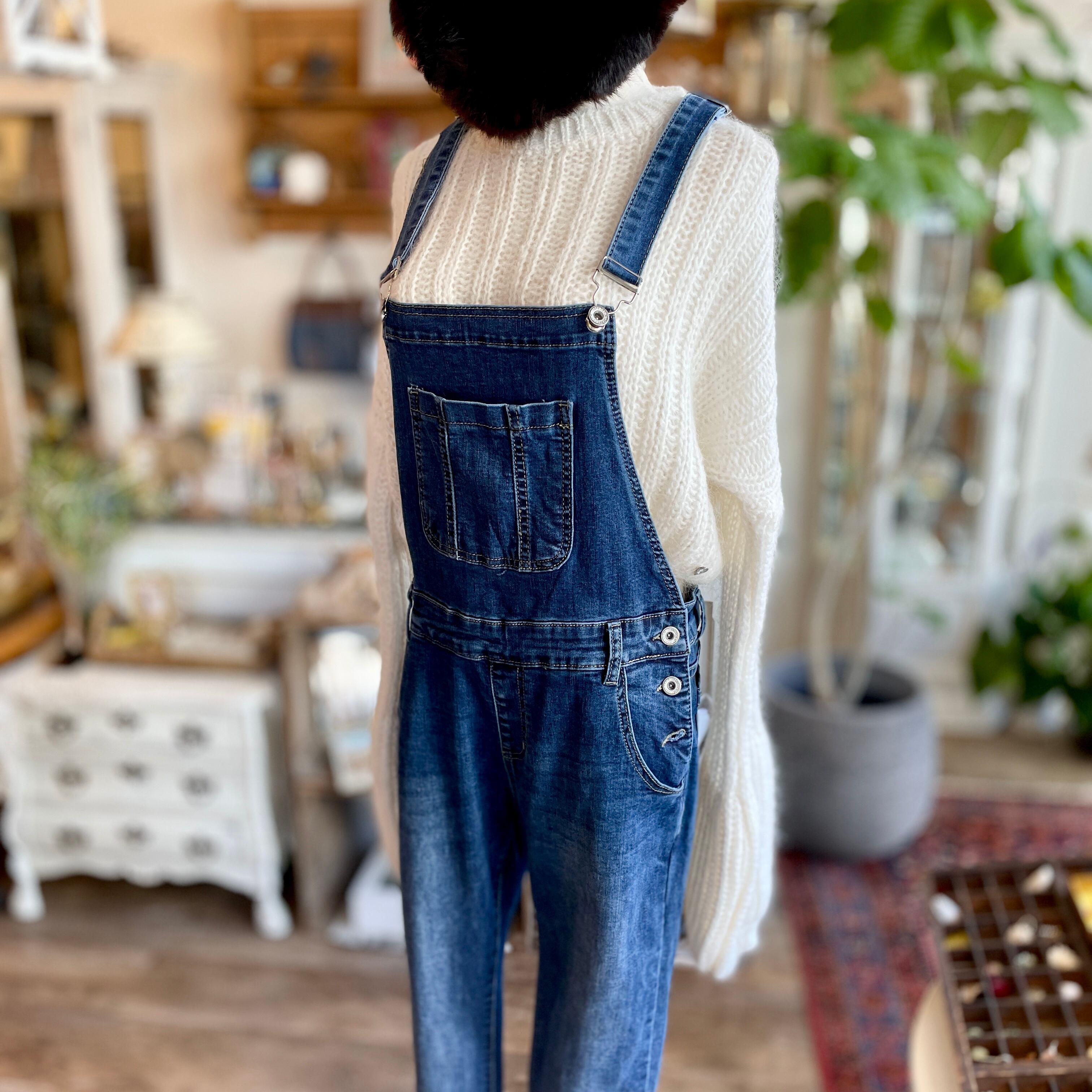 袖にボリュームのあるざっくり編みが可愛らしいニットに、定番のデニムサロペットを合わせたコーディネイト。サロペットは伸縮性もあるので楽に着ていただけます♪