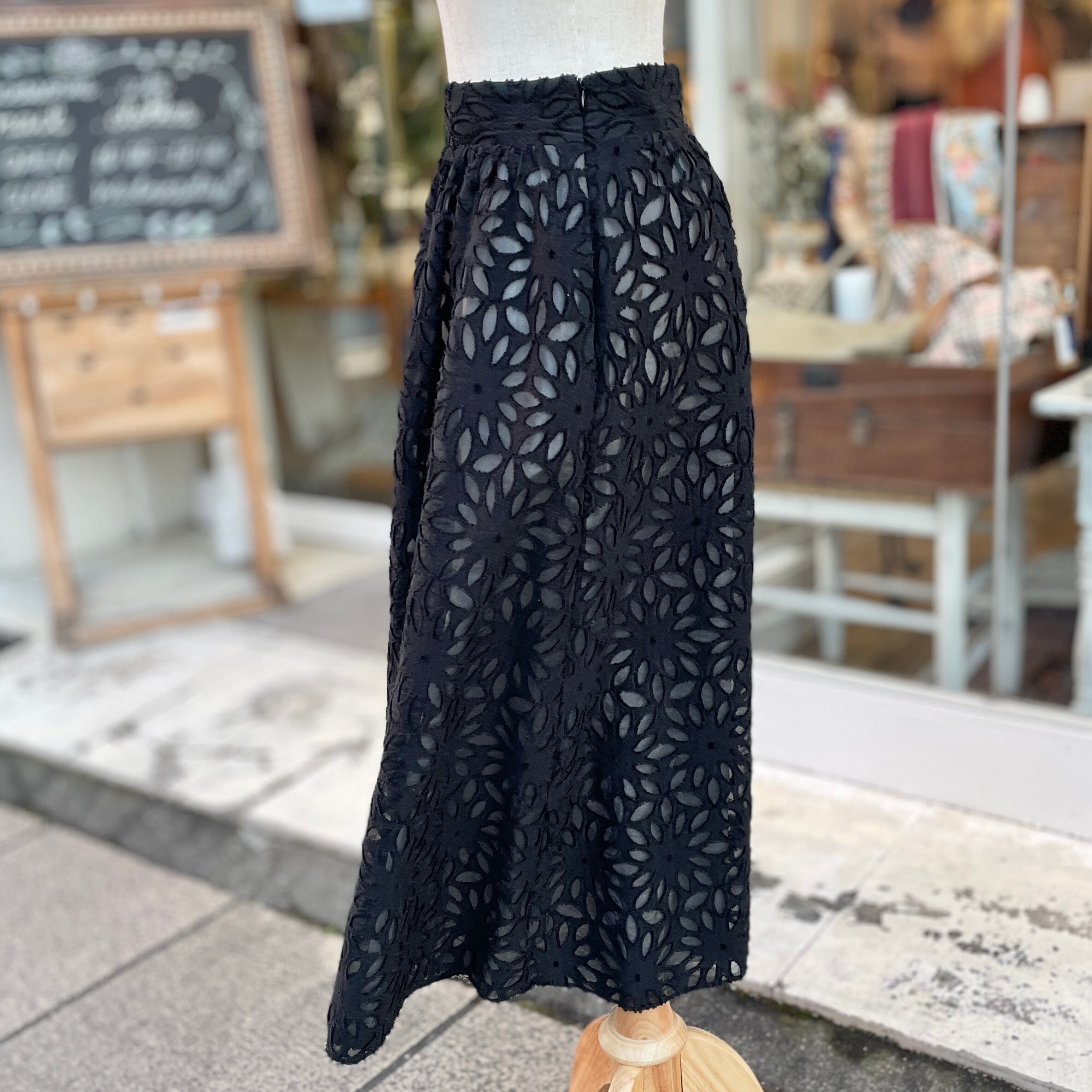 オーガンジーの透け素材が素敵なスカート♪ ホワイトの裏地がリーフ形に切り込まれたデザインを浮き上がらせます。オーガンジーですが裏地も付いているため、冬場も着用可能です。
