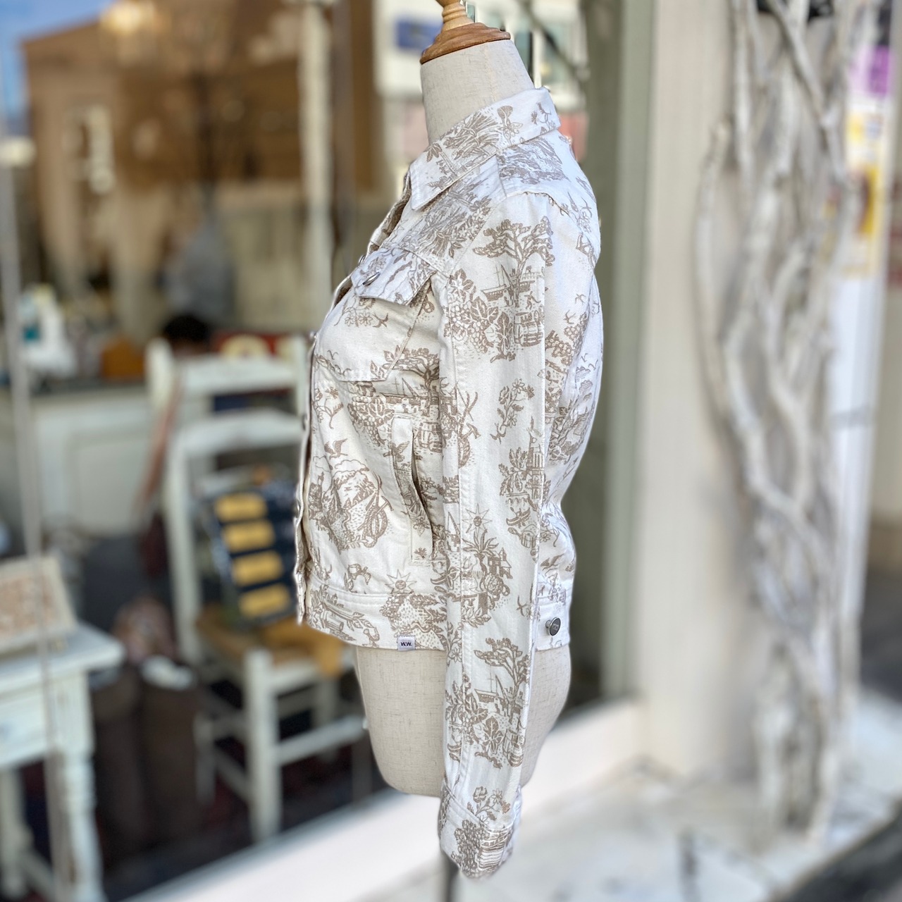 植物や鳥や海などの自然が描かれたホワイトデニムジャケット。細身のシルエットが綺麗に着こなせます。