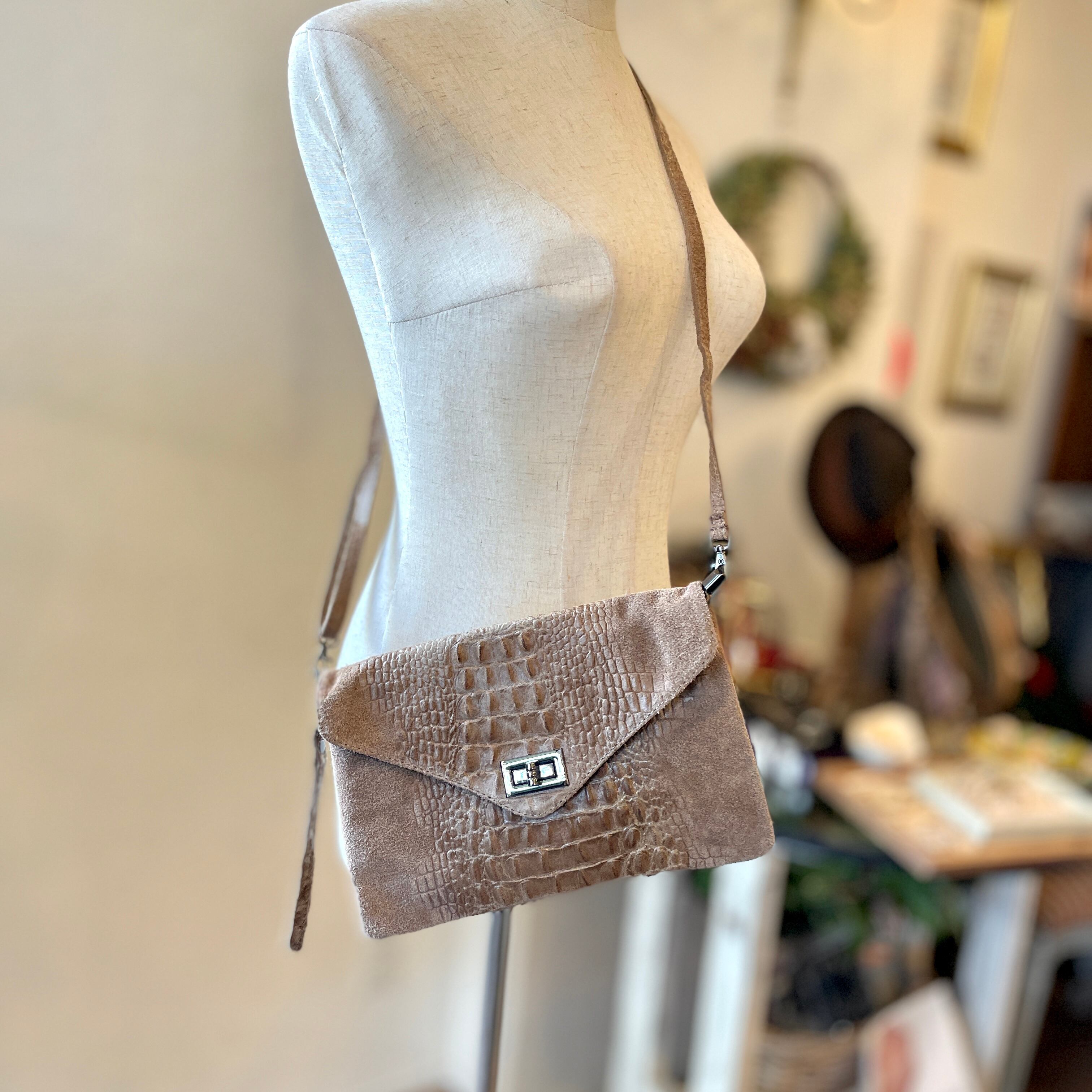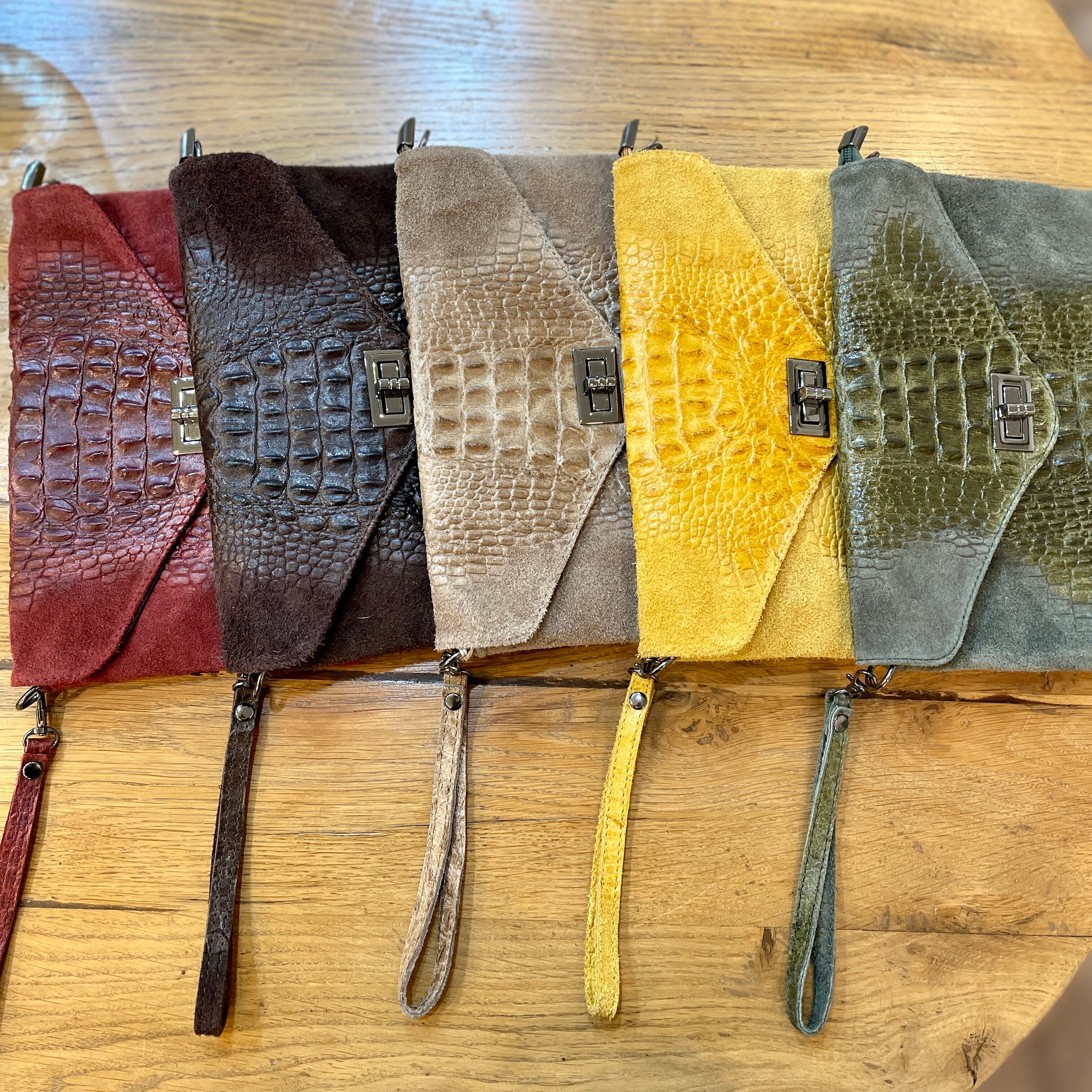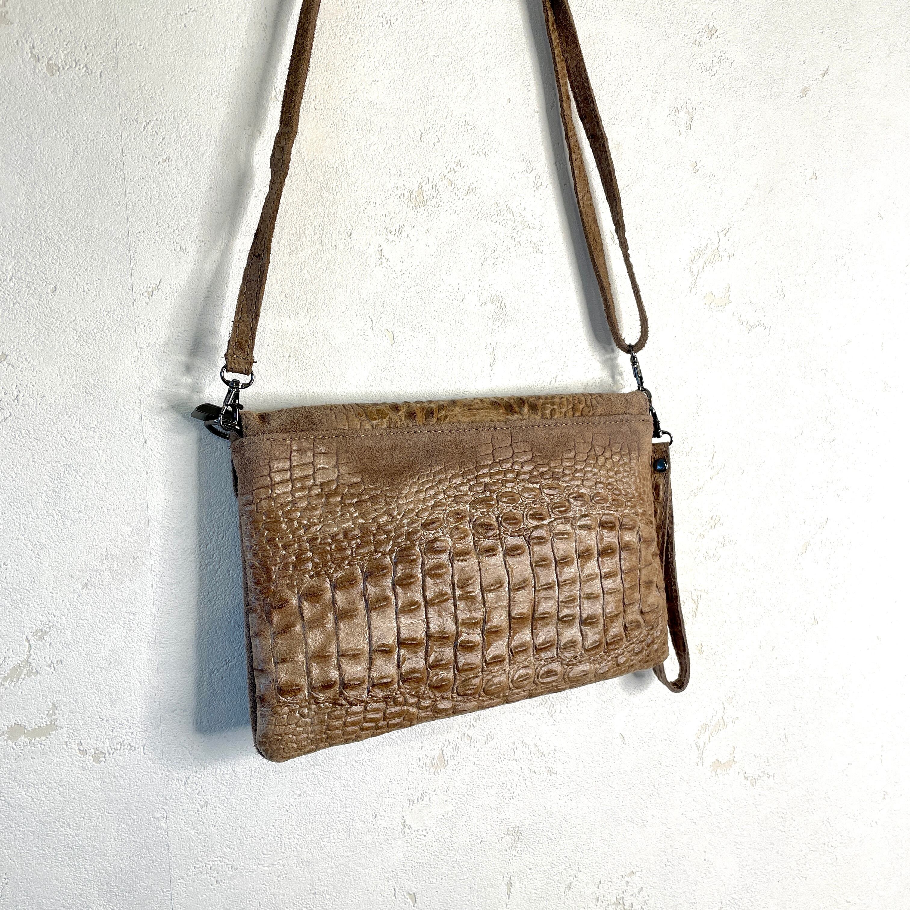 柔らかい牛革のハンドクラッチバッグ。クロコの型押しがデザインされています♪ 肩掛け紐も付いていて2WAYで使用可能です。