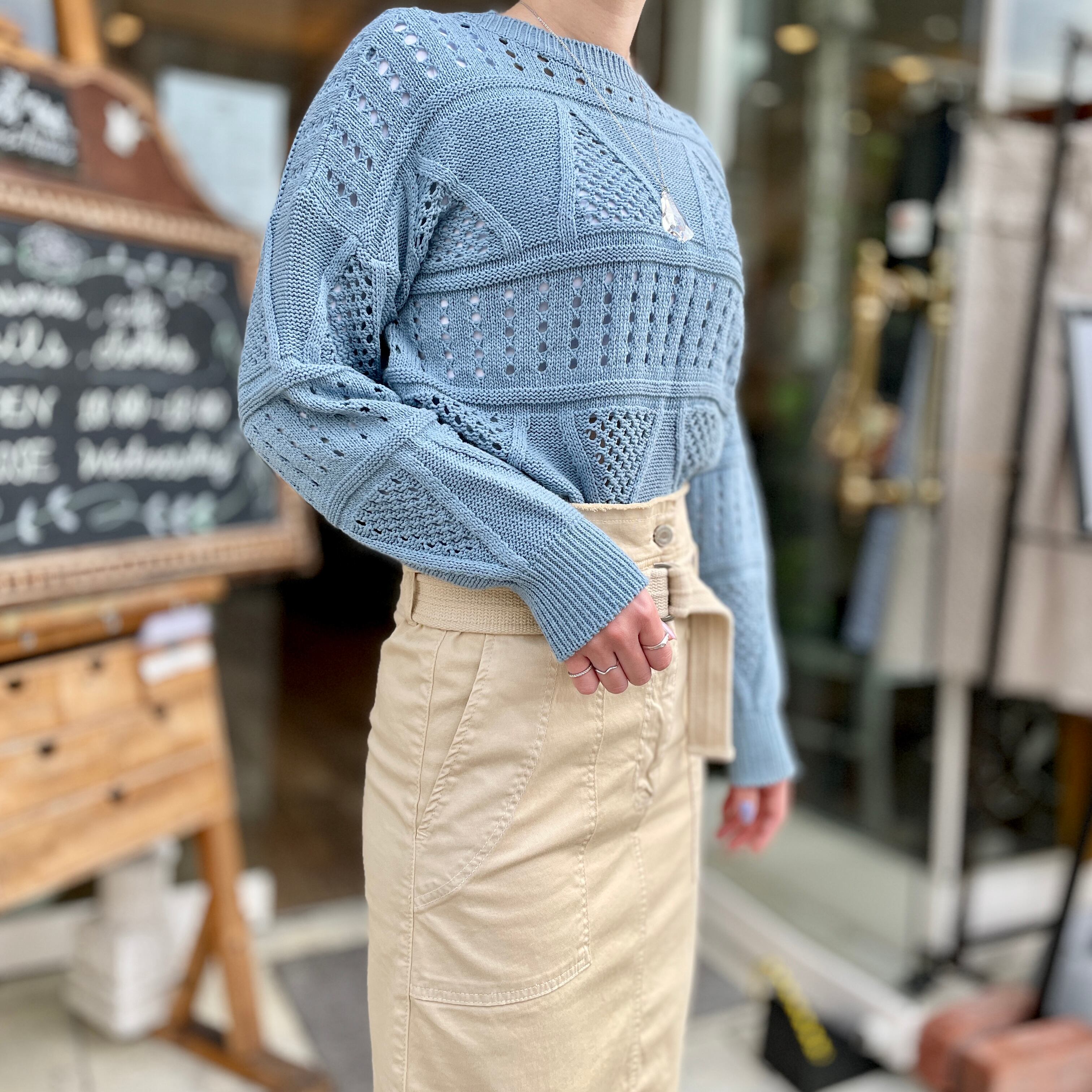 [コーデ買い] で【 50%OFF! 】2点 イタリア製 ViCOLO デザイン編み込みニット 3色展開<スカイブルー> + vanessabruno ハイウエスト ベルト付きフリンジスカート