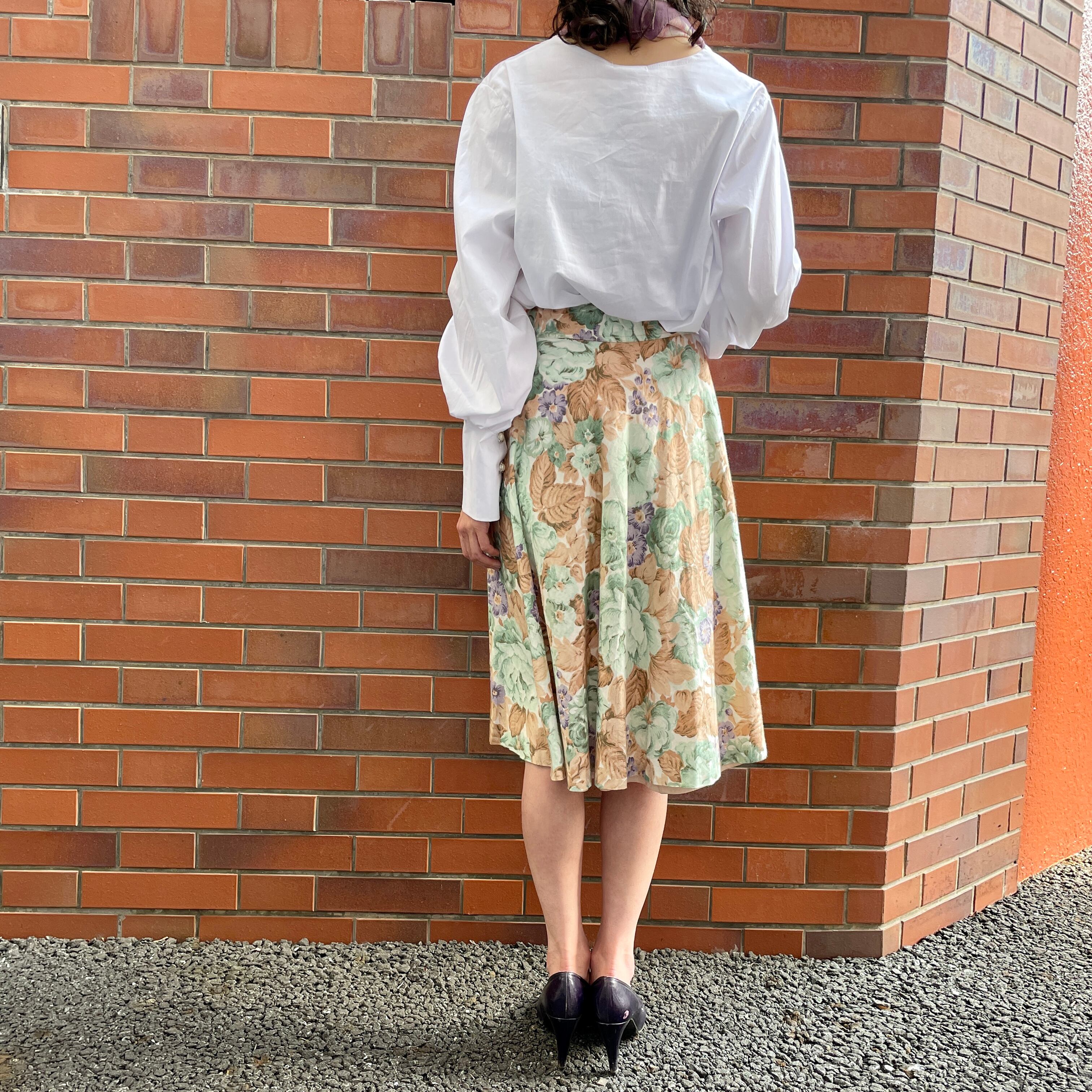 [コーデ買い] で【 30%OFF! 】2点 イタリア製 パール調ボタンブラウス + フランス古着 Charles ANDREA 淡色花柄ひざ丈フレアースカート