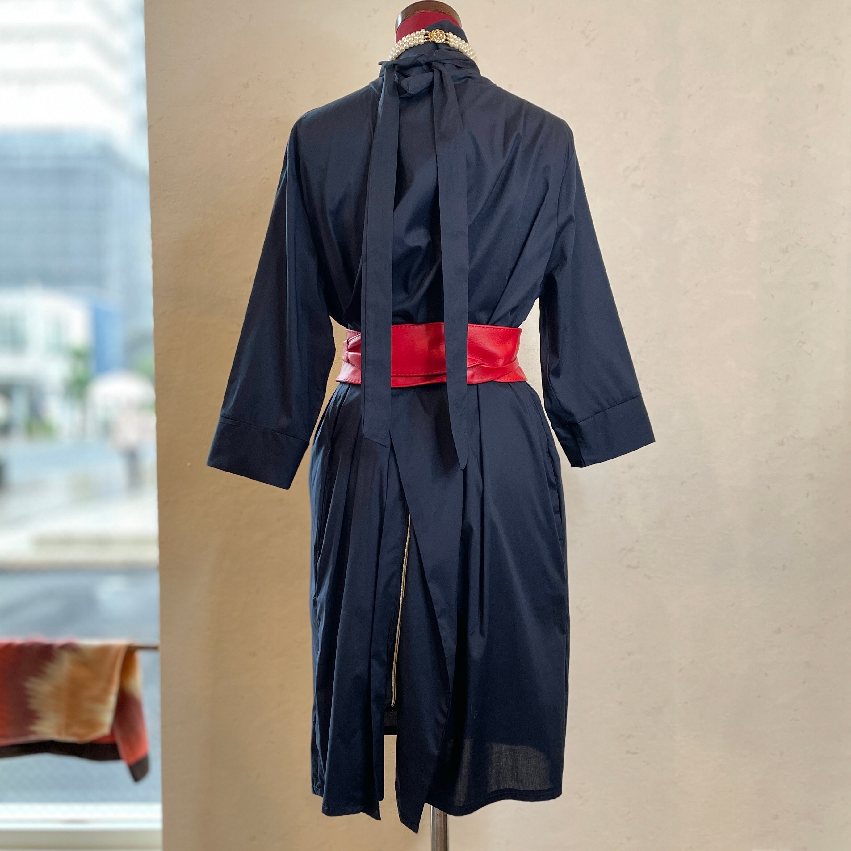 ネイビーに赤いベルトが映える印象的なコーディネイト。ワンピースを前後逆向きに着用し、ウエストのベルトで首元をとめることで簡単にドレスアップが可能です。パールのチョーカーを使用することで、華やかでキュートな雰囲気に♪