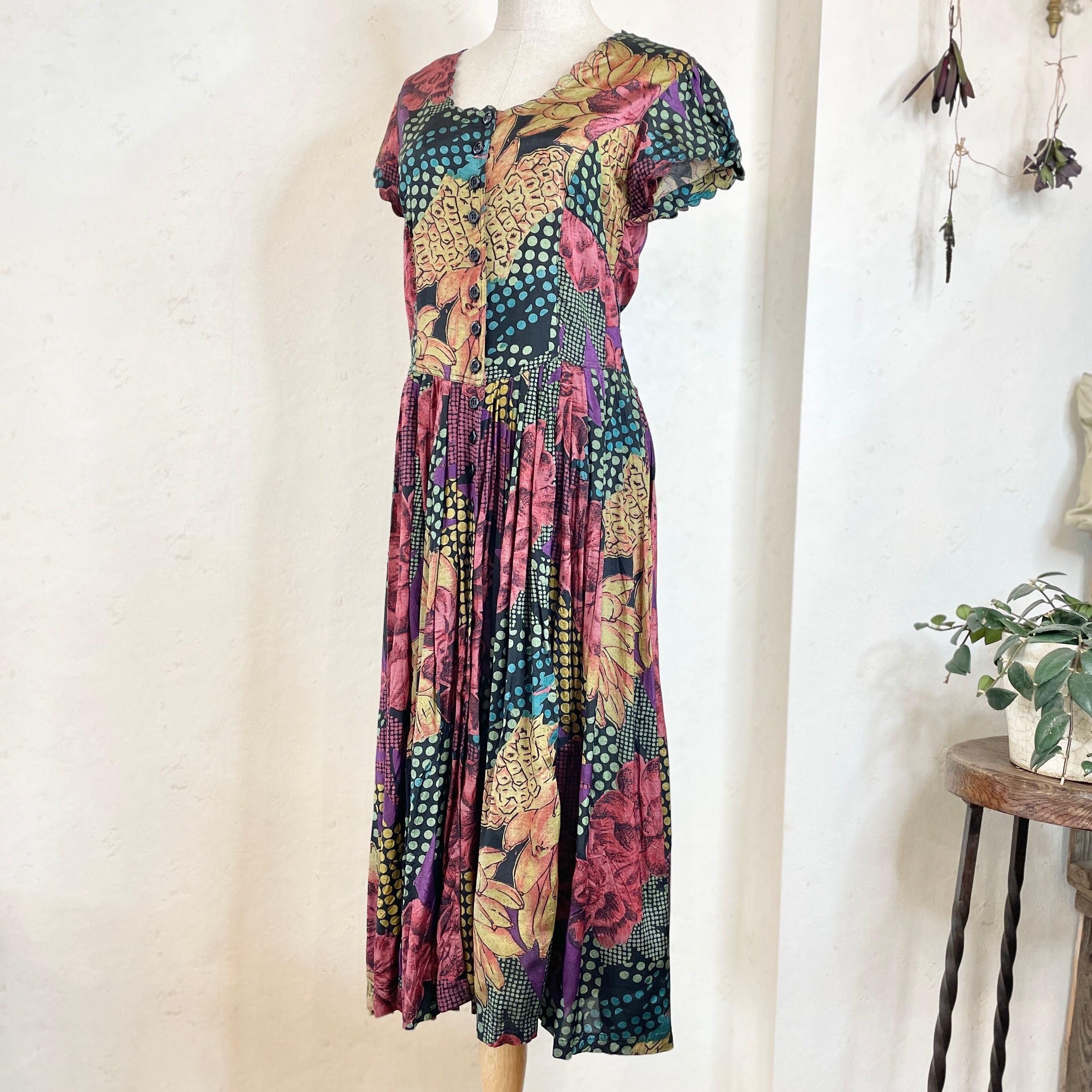 カラフルなフルーツと花柄とドットの組み合わせのワンピースです。黒地で引き締まった印象になります。襟と袖が波のような可愛いデザインになっています。