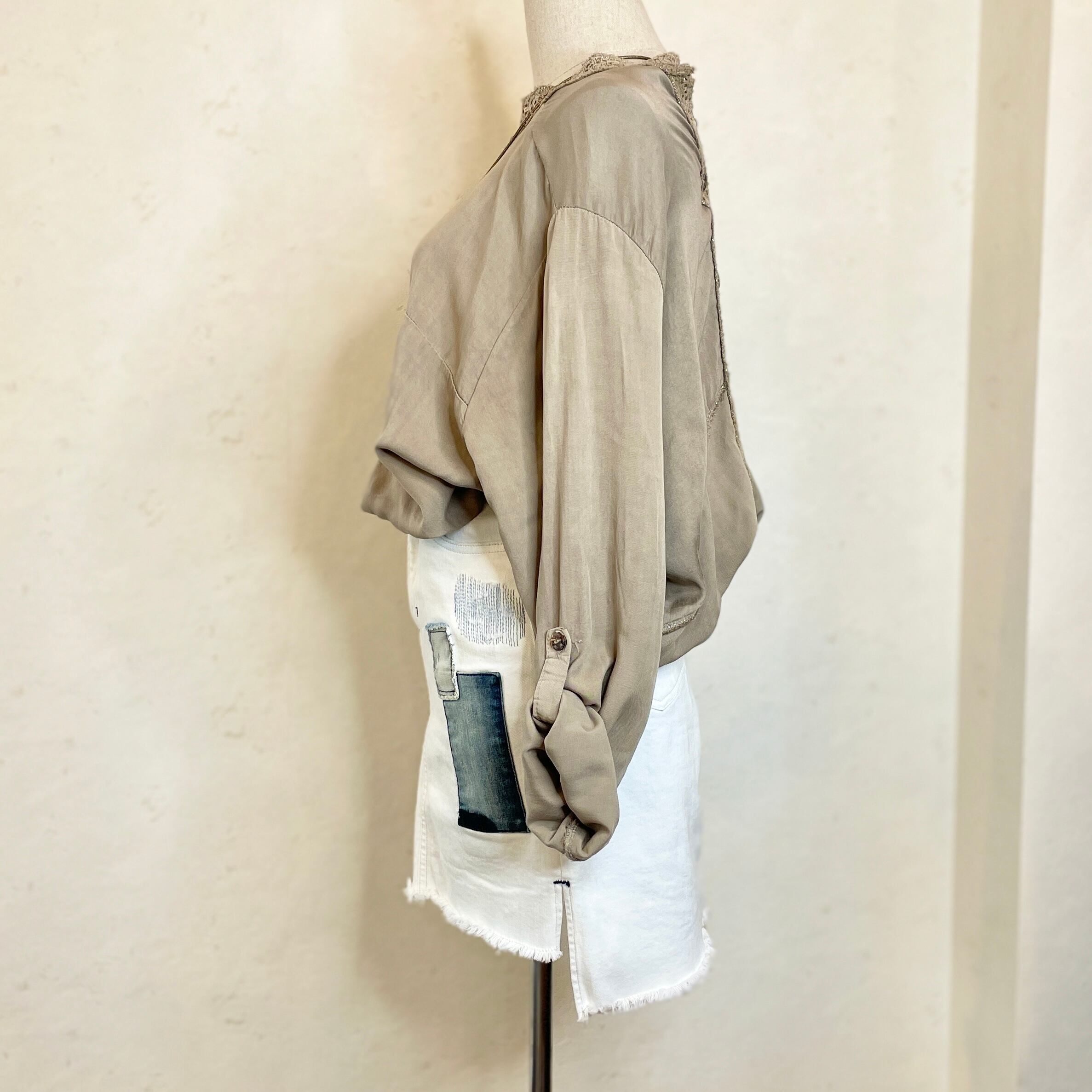 トップスは前後逆でも着用可能なアイテムです。前後のデザインが違うため、逆に着用することで全く違った印象を楽しめます。タイトなスカートを合わせることで脚長効果があります♪