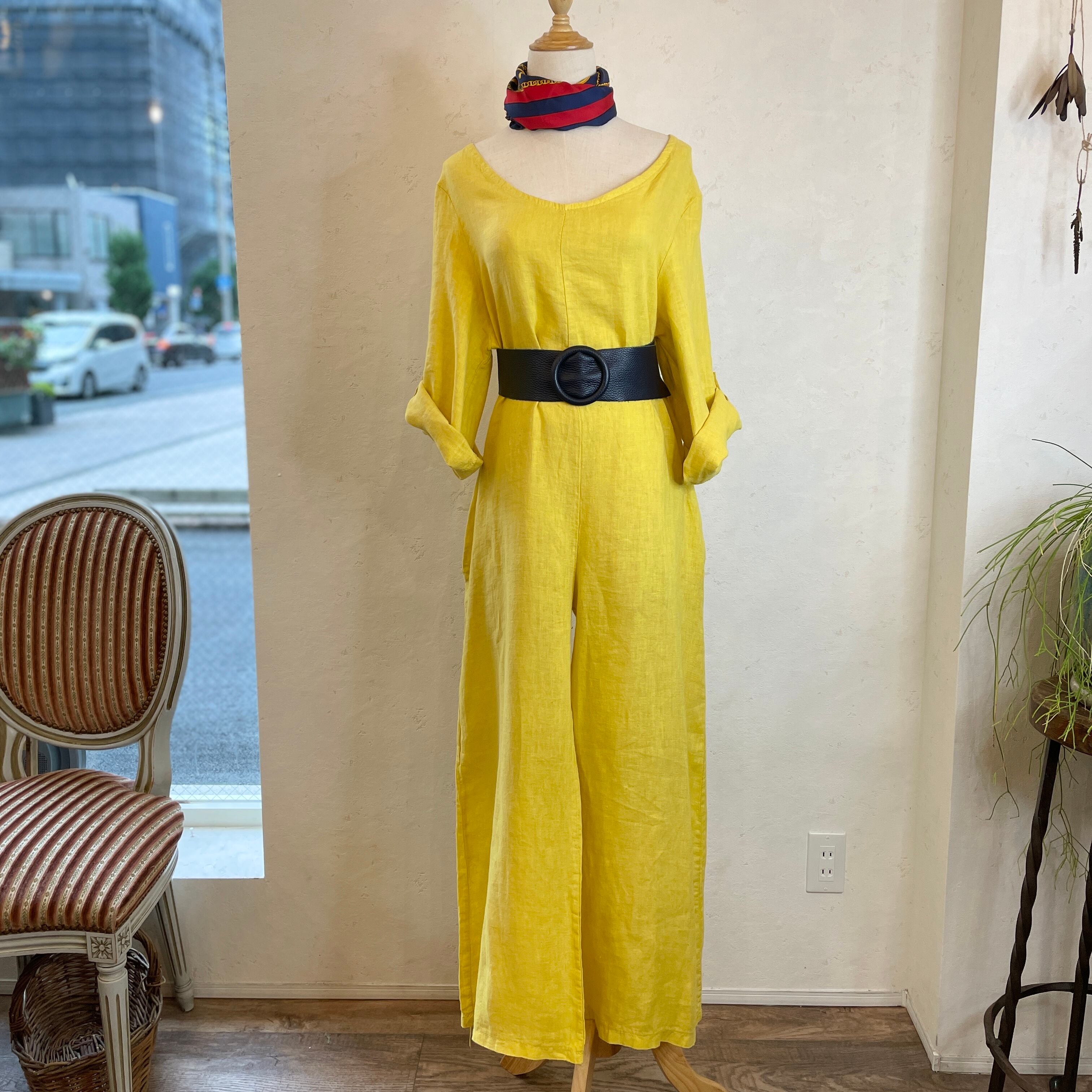 オールインワン: イタリア製 麻100% 袖ロールアップ オールインワン