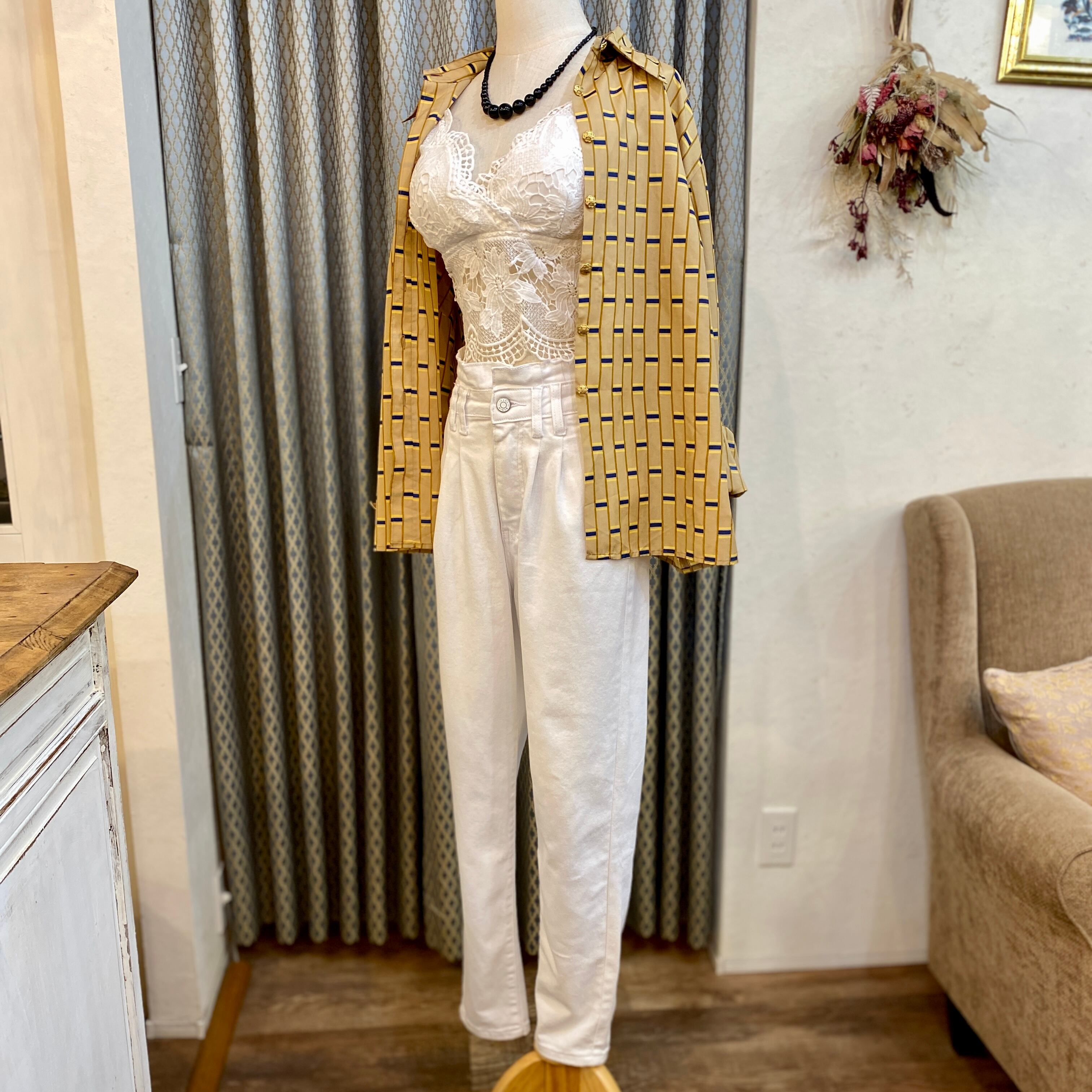 [コーデ買い] で【 30%OFF! 】3点 フランス古着 Clavieres 柄シャツ + ハイウエスト テーパード デニム + パット付き レースビスチェ<ホワイト>