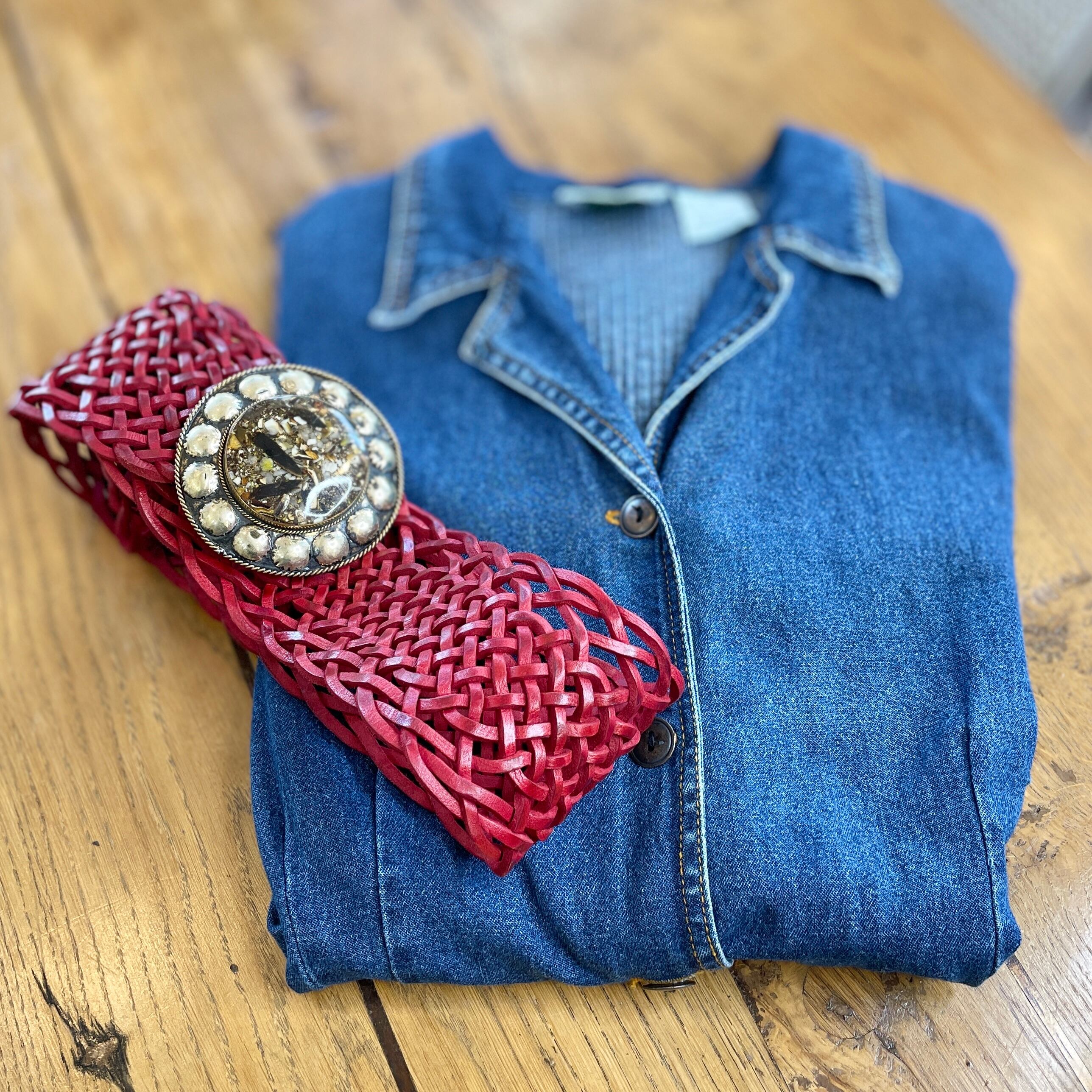 [コーデ買い] で【 30%OFF! 】2点 古着 Olivia Rose デニム 開襟ワンピース + イタリア製 レザー メッシュベルト<レッド>