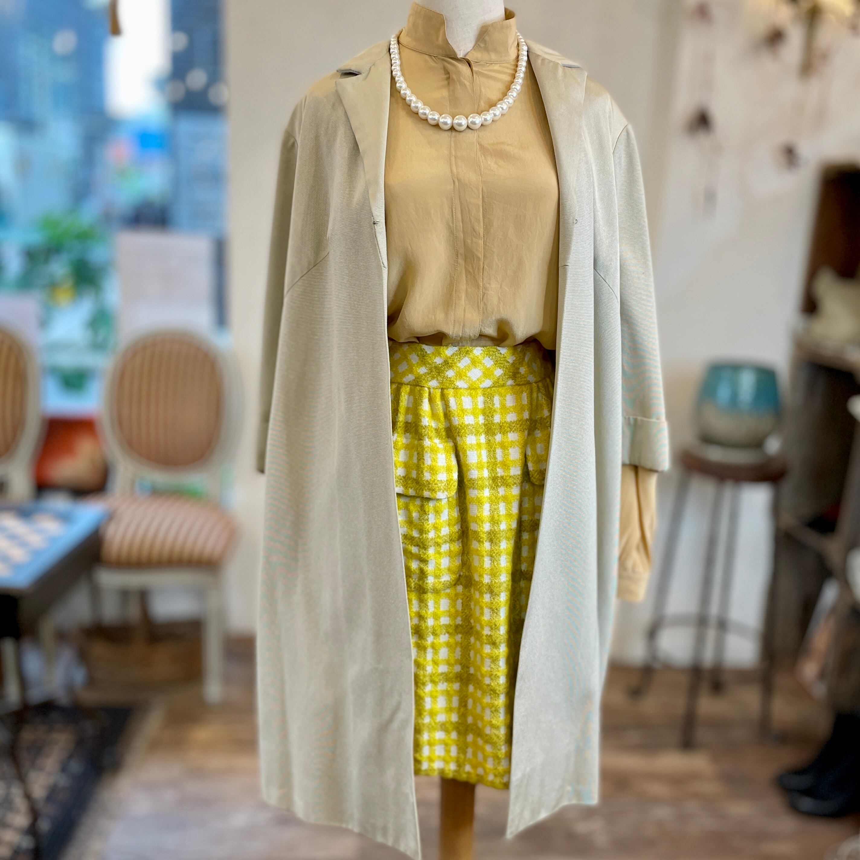 [コーデ買い] で【 35%OFF! 】3点 フランス古着 七分袖ベージュコート + ヨーロッパ古着 Oooi フライフロント スタンドカラー ブラウス + フランス古着 ツイードチェック柄スカート