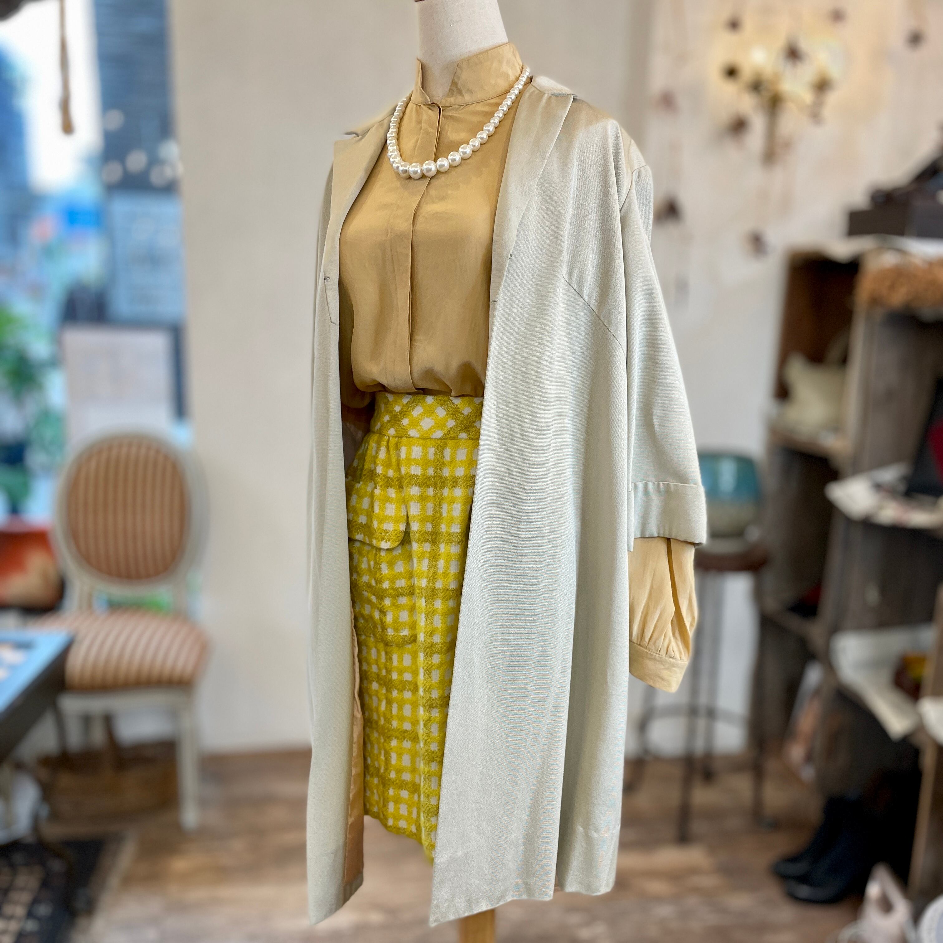 イエローのスカートが主役の柔らかいカラーのコーディネート。コートやブラウスは華やかなスカートをコーデに馴染ませつつ、際立たせてくれる相性のいいアイテムです。