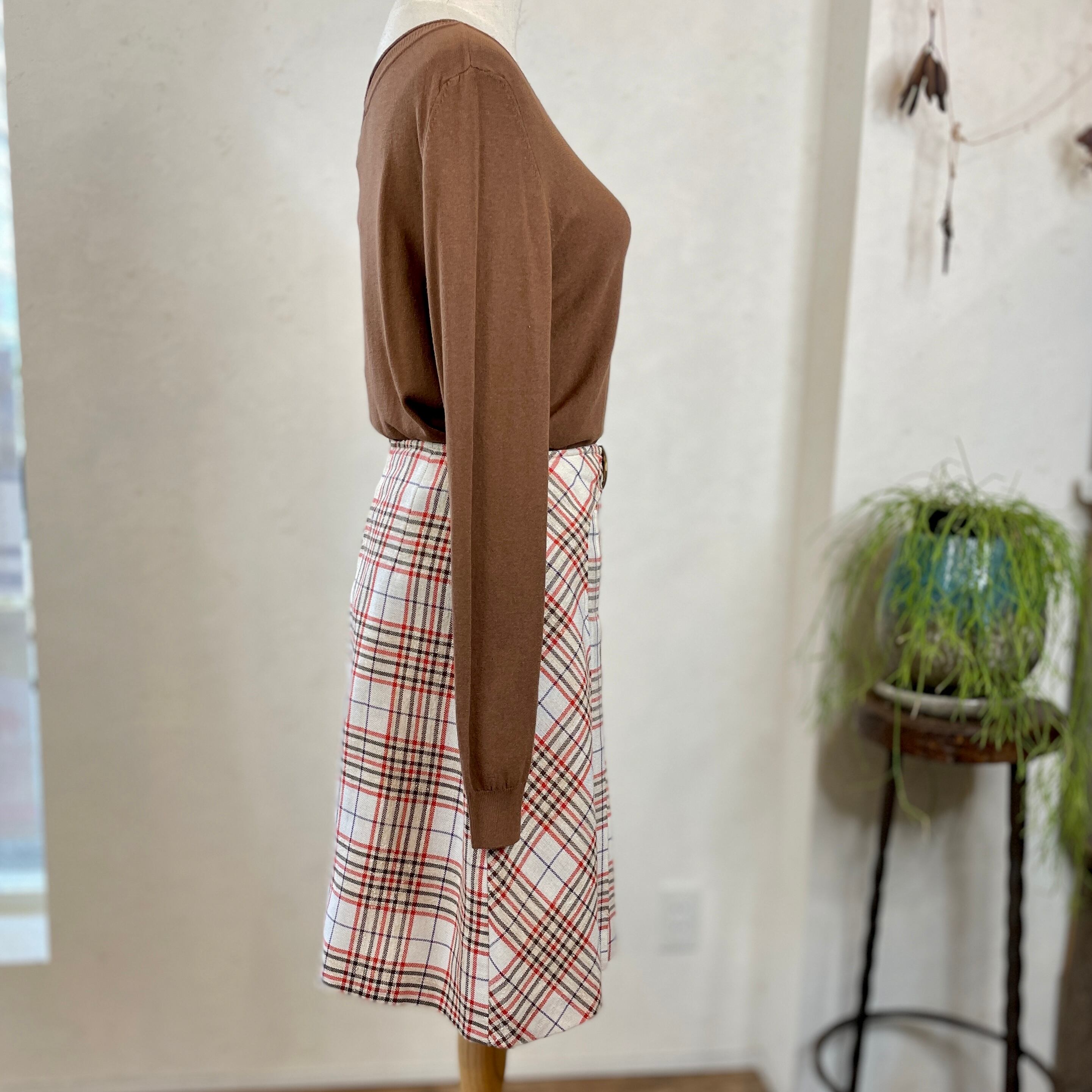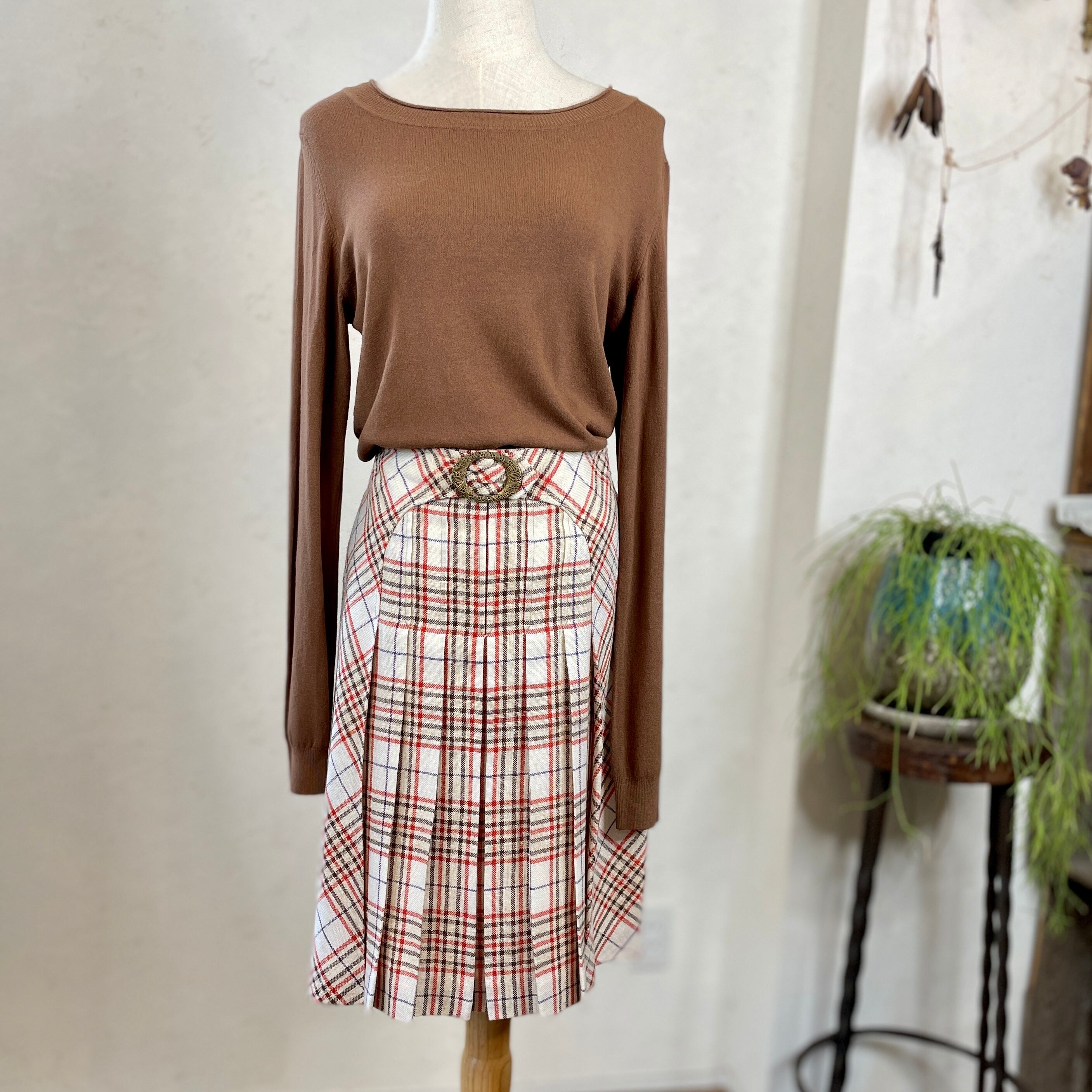 スカート: フランス古着 レトロ ベルトデザインチェック柄スカート