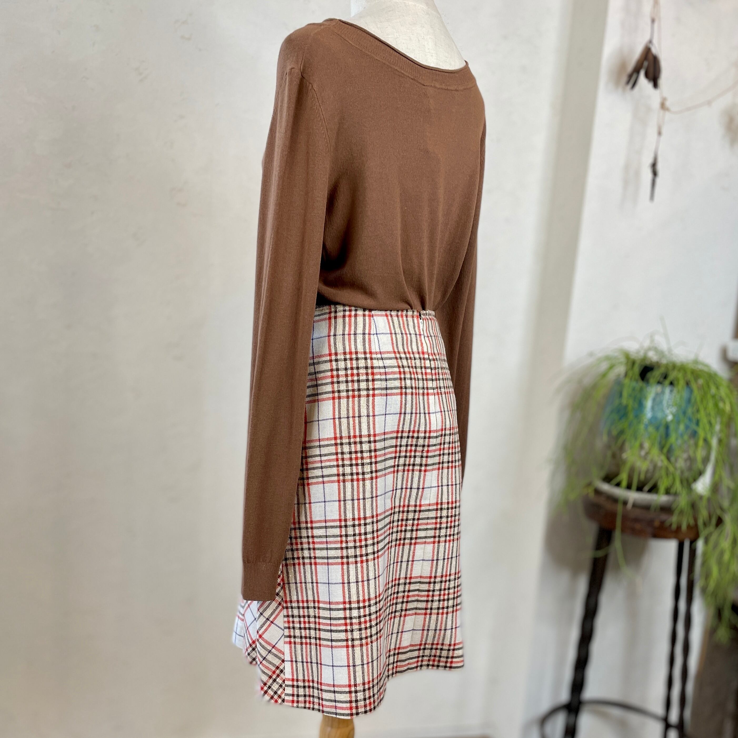 [コーデ買い] で【 30%OFF! 】3点 フランス古着 ネイビー チェスターコート + イタリア製 Les Copains カットオフカラー薄手ニット<ブラウン> + フランス古着 レトロ ベルトデザインチェック柄スカート