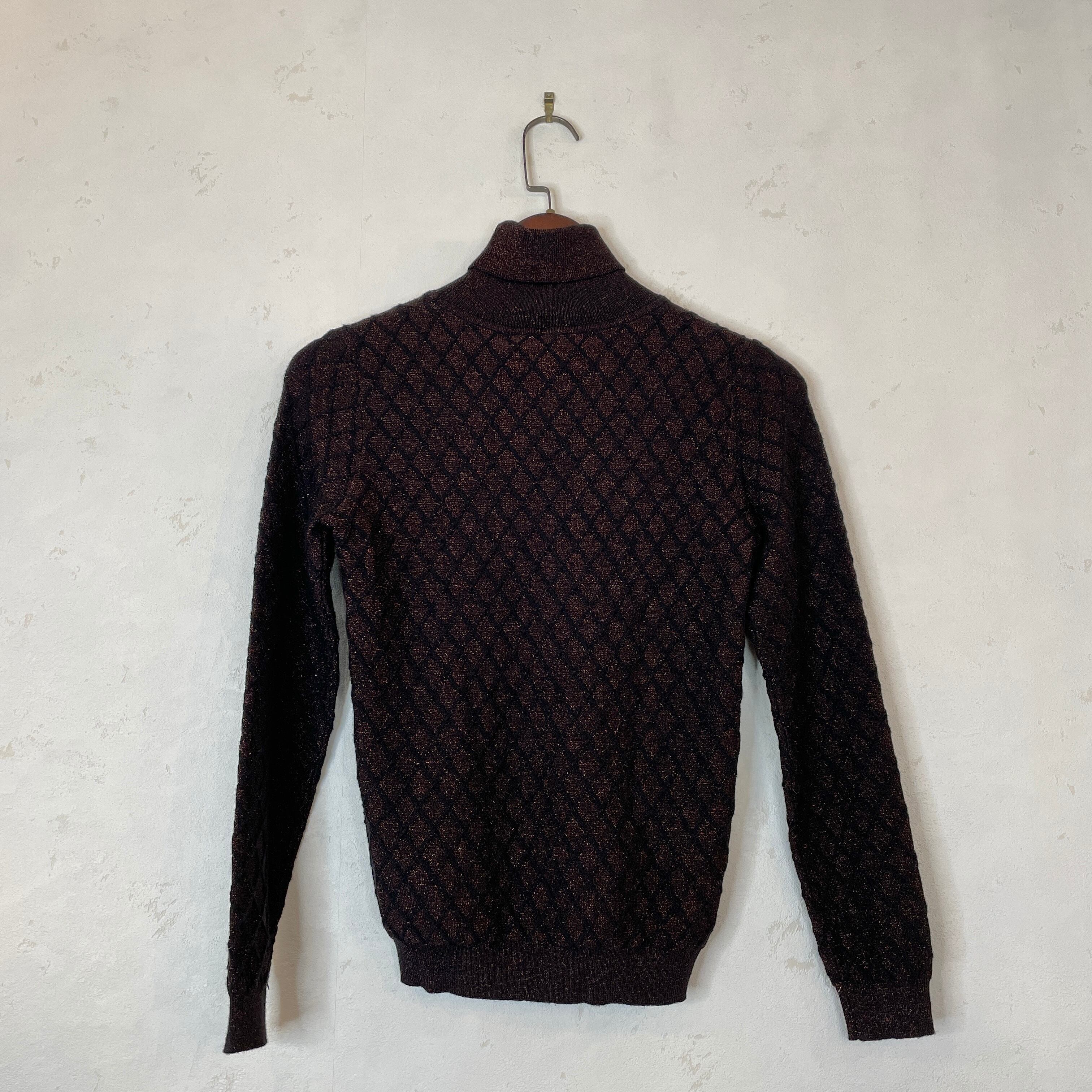 ラメの入った生地が素敵なタートルネックトップスです。裾にブランドのロゴパーツが付いています。