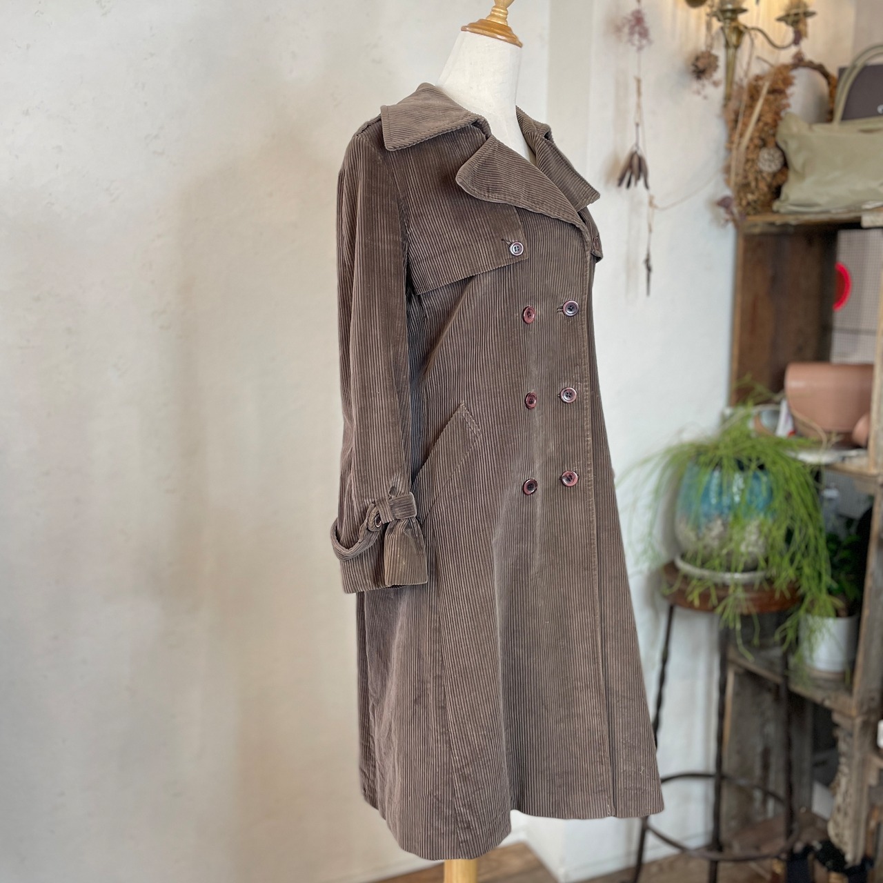 落ち着いたブラウンのコーデュロイトレンチコート。格好の良いすらっとしたシルエットです。