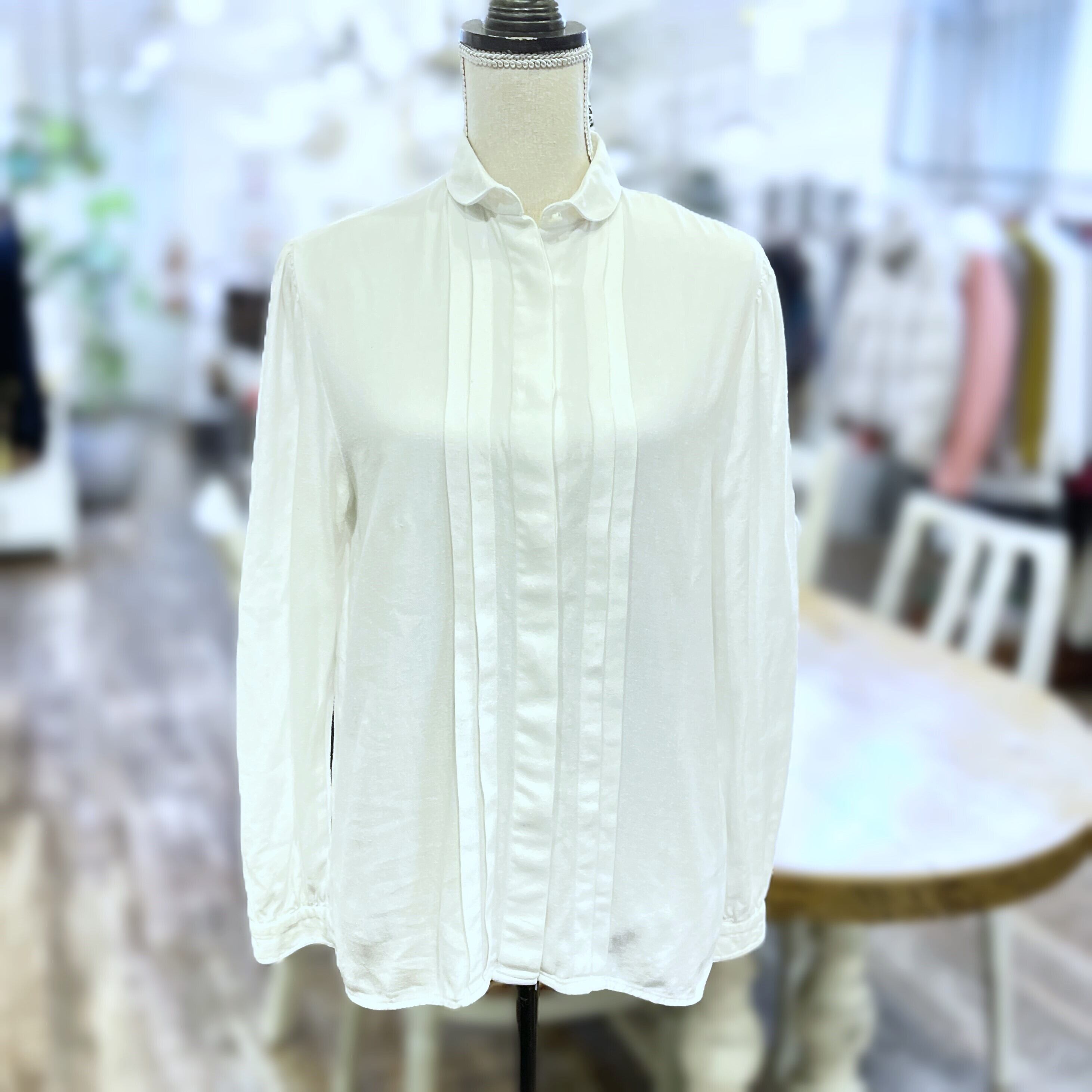 フロントのプリーツと丸襟がかわいらしいコットン生地のシャツブラウス。どんなコーデにも合わせやすいアイテムです。
