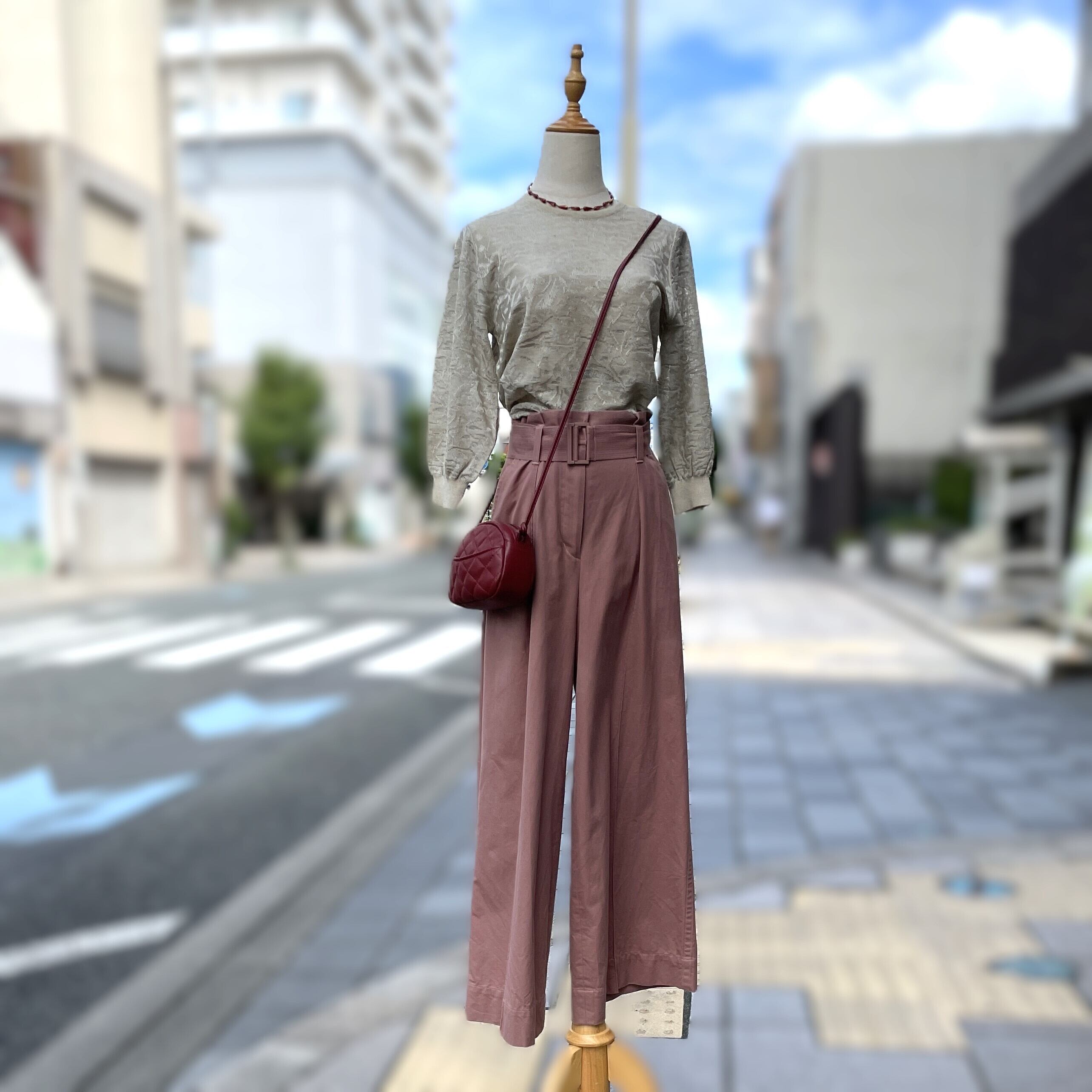 ワイドに落ちるパンツのラインがスタイルアップになり、ベージュとくすみのあるピンクの色合いが大人っぽく上品な印象に。馴染みやすい色味のアイテムはお持ちの服にも合わせやすく着回しのきくアイテムのセットです。