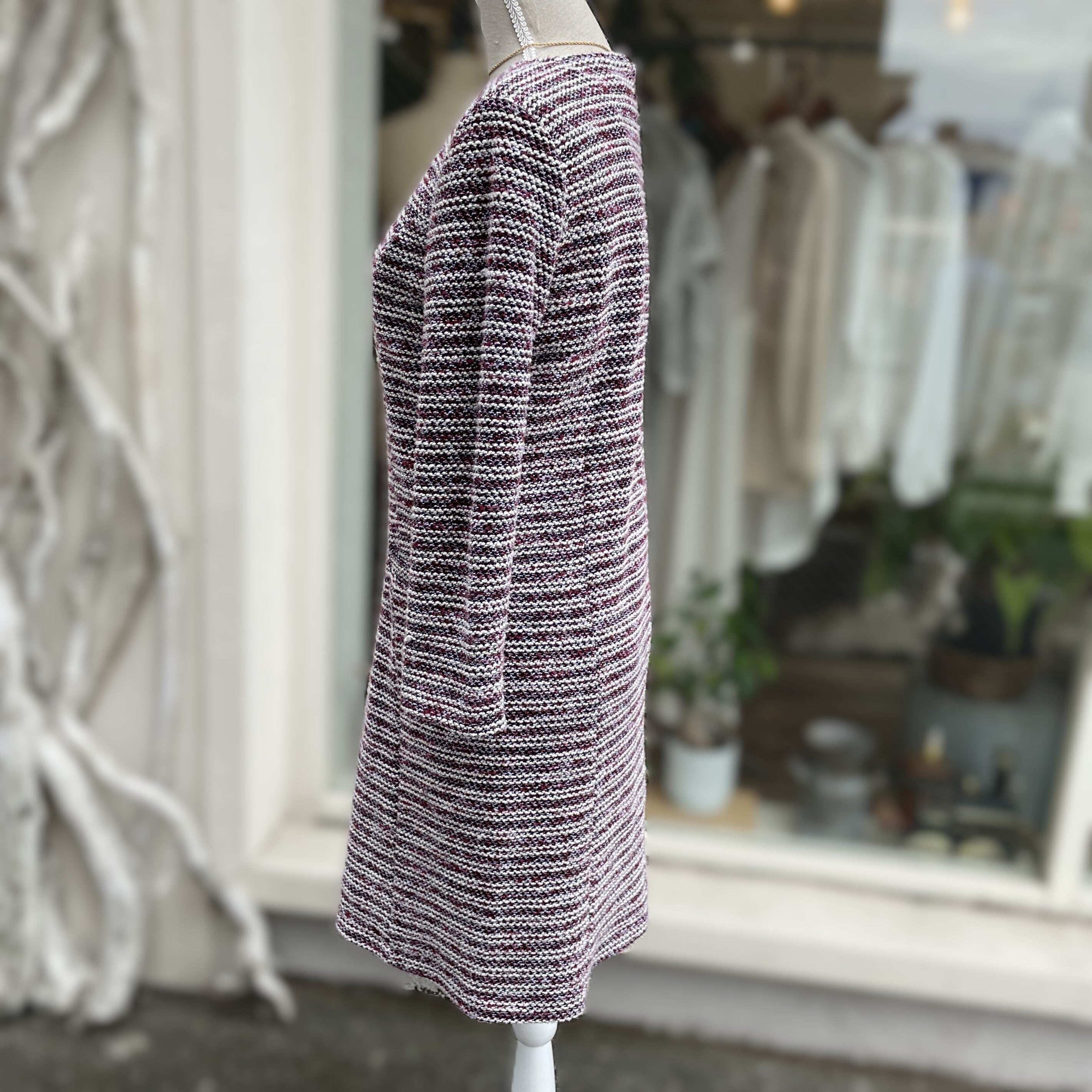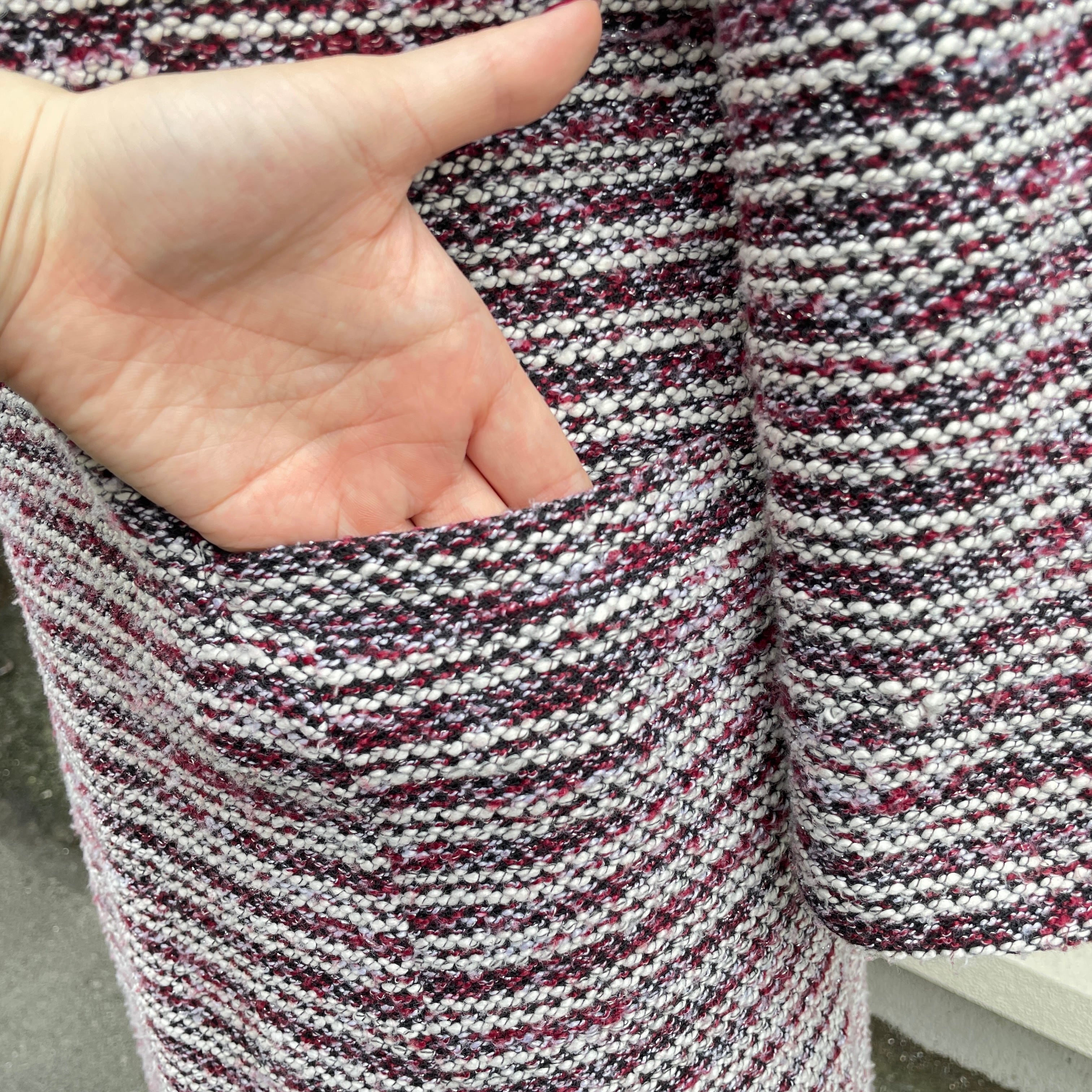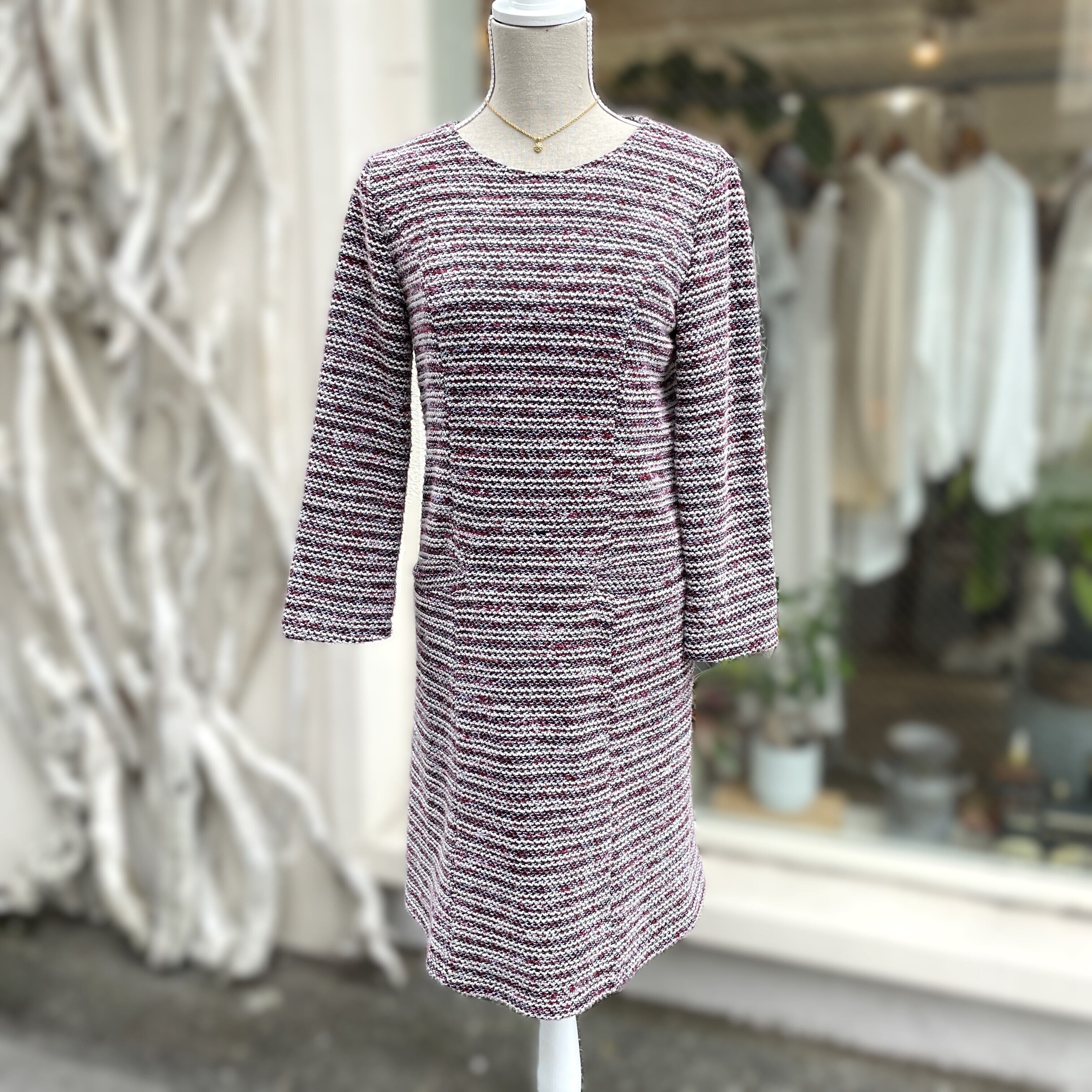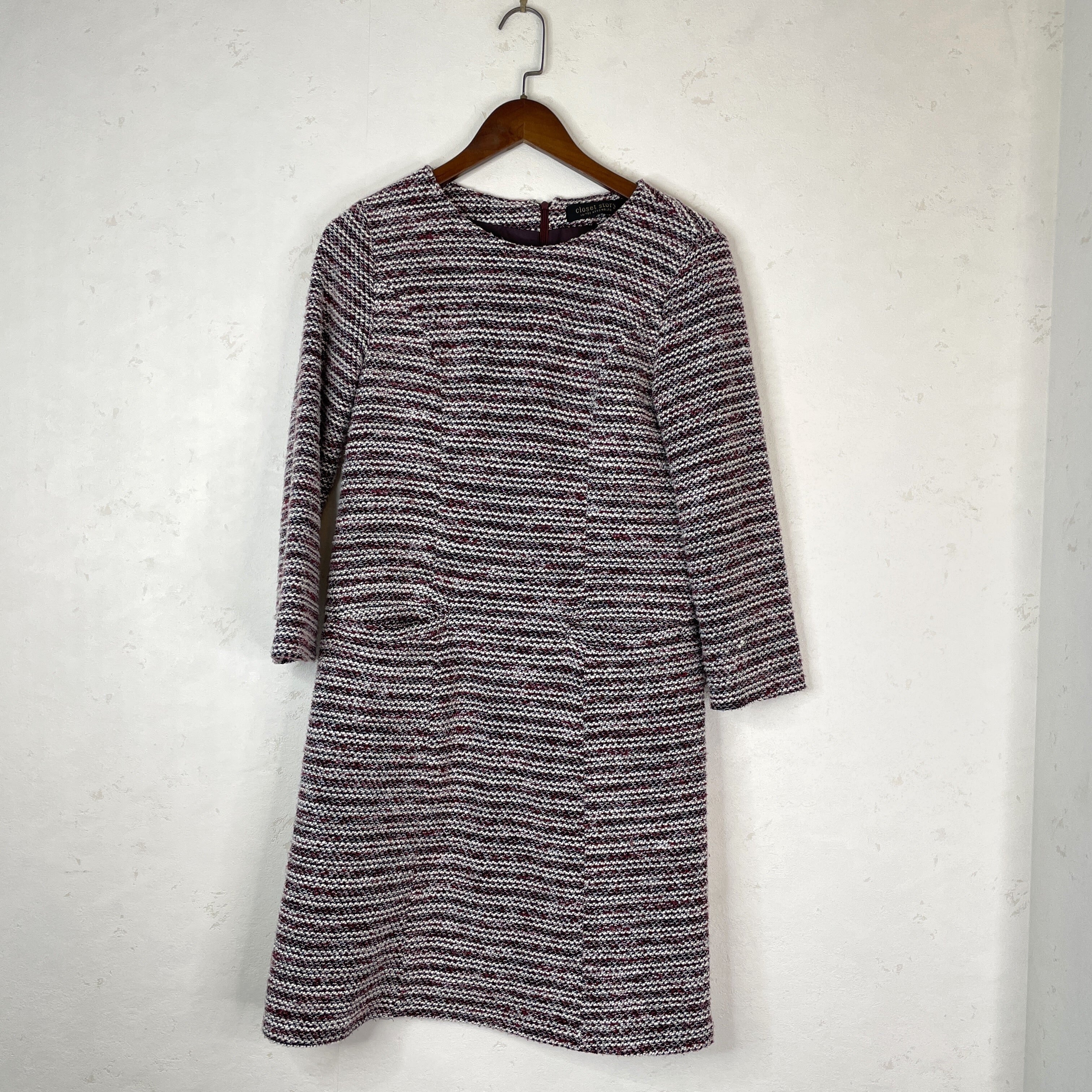 ワインレッド×ホワイト×ブラックのツイード風の生地で上品なデザインの長袖ワンピース。